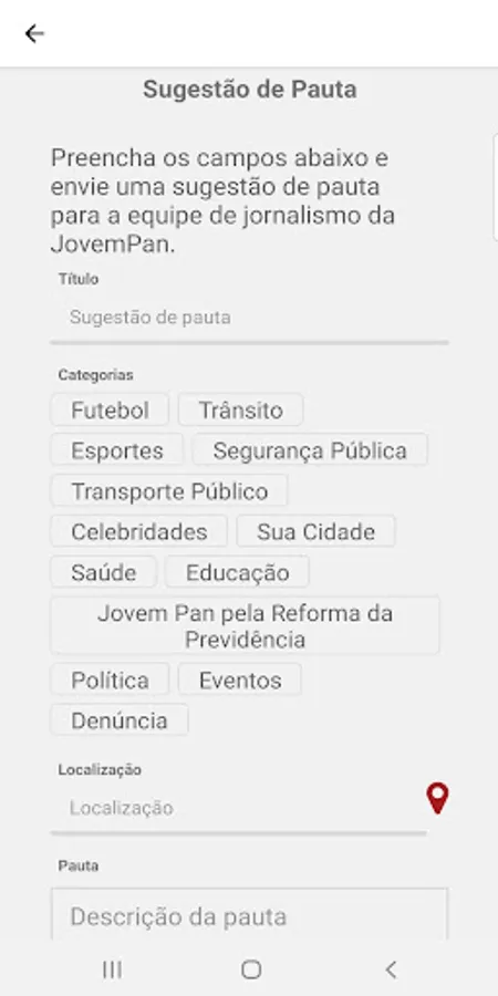You can register an important event the instant it happens (traffic accidents, floods, political or cultural events, complaints, etc.). Your collaboration will be evaluated by Jovem Pan's journalism team and can be shared on the schedule, giving visibility to the fact and quoting the user who sent it.