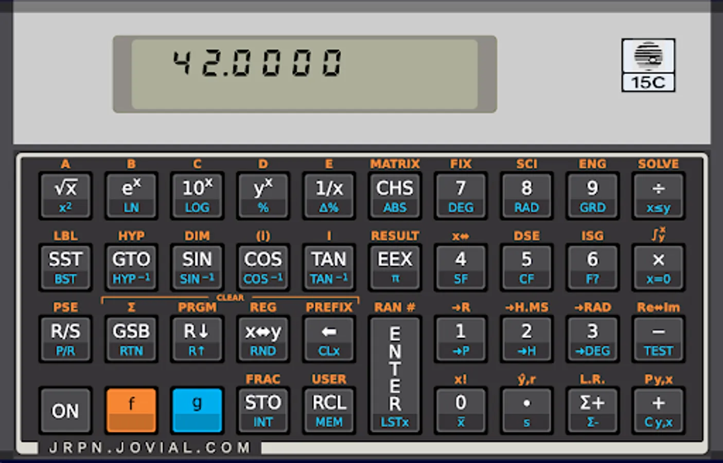 Scientific calculator that simulates an HP-15C. It simulates the appearance and behavior of the original, including the seven-segment display, and the little blink you get when entering numbers. Includes complex math, matrices, numerical integration, solving for the root of an equation and statistics. Very state of the art for 1982!