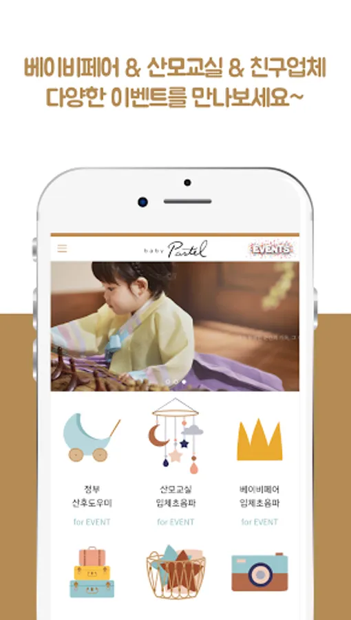 Baby Pastel [EVENT] app provides and guides a variety of helpful information to mothers. It is designed with an intuitive UI for easy use.