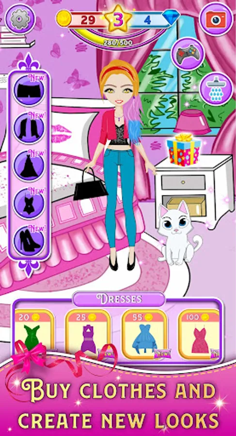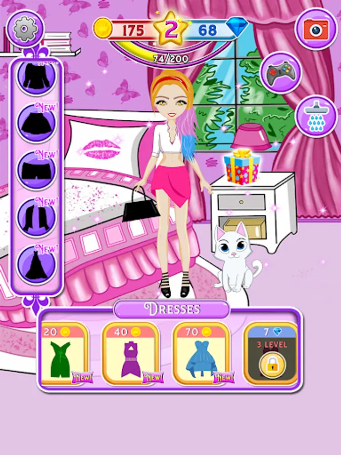 Welcome to the new Shopping Fashion City - Dress Up Girl🚺 Immerse yourself in the world of fashion and shopping. Now you have your own room with a large selection of clothes. In your wardrobe there are clothes for all occasions, evening dresses, puffy skirts, shiny shoes, beautiful blouses, fashion jewelry, various hairstyles, colorful handbags. Have cute pets, such as a furry cat. Create interesting stylish images of girls, models, dress up for a photo shoot or on the beach.
