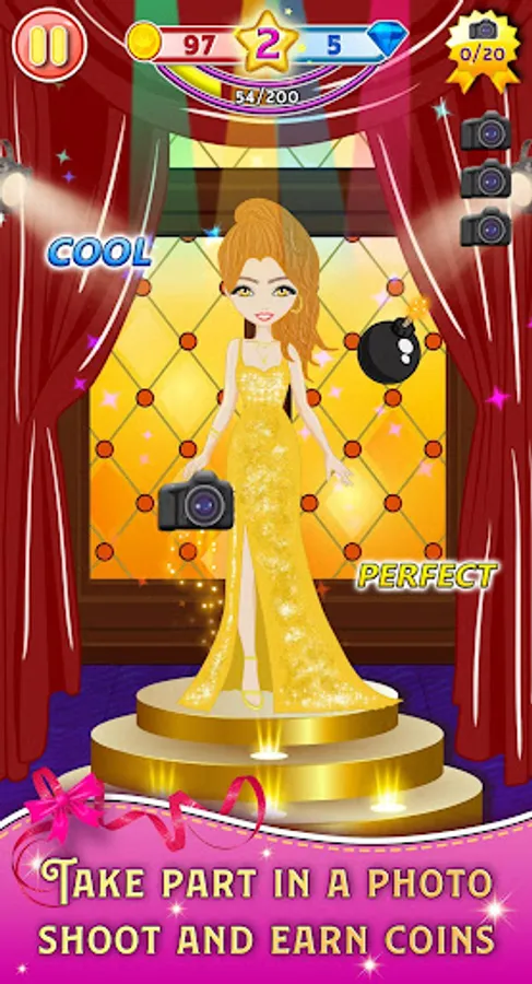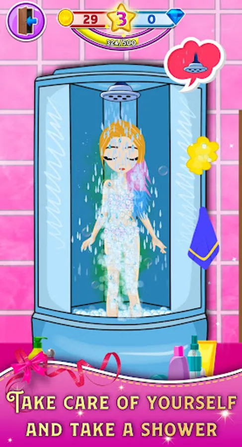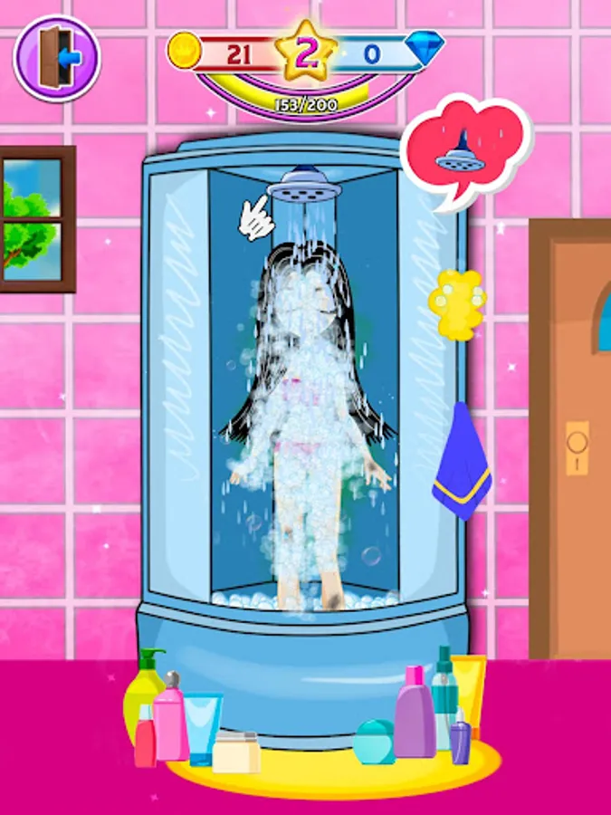 You need to take a shower periodically. Come into the bathroom and bring beauty. After that, go to a fashionable city and play different MINI GAMES to gain experience, earn coins and crystals and go to a new level.