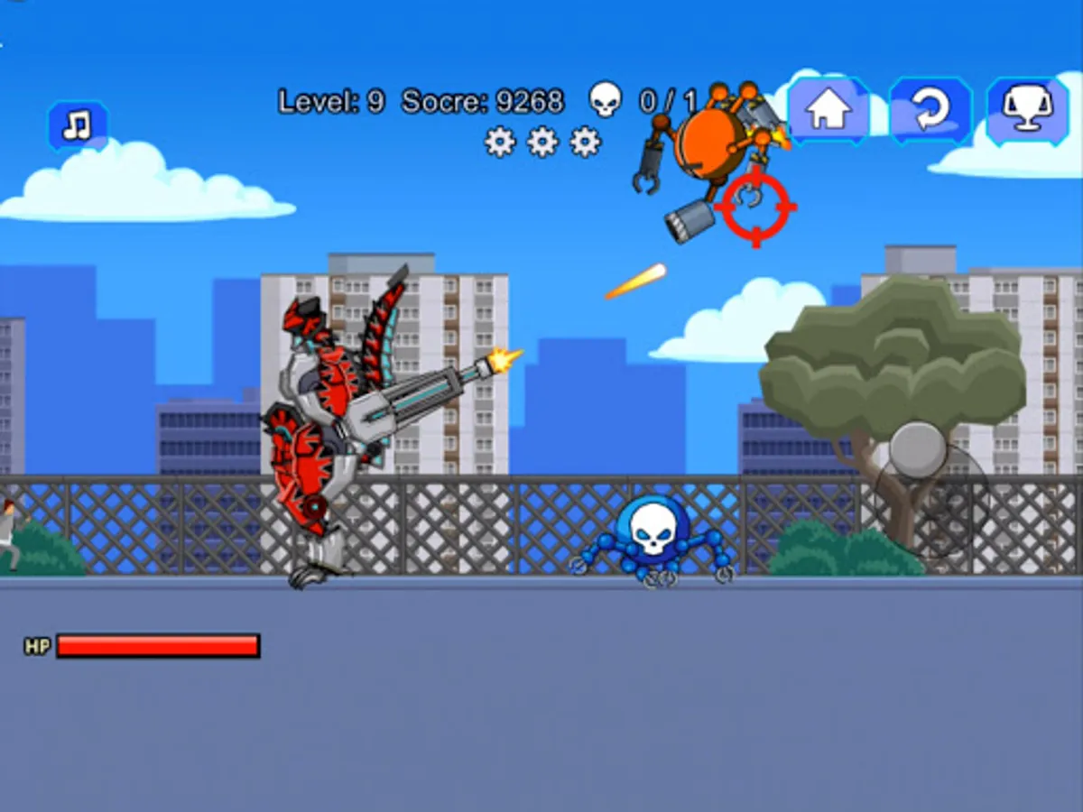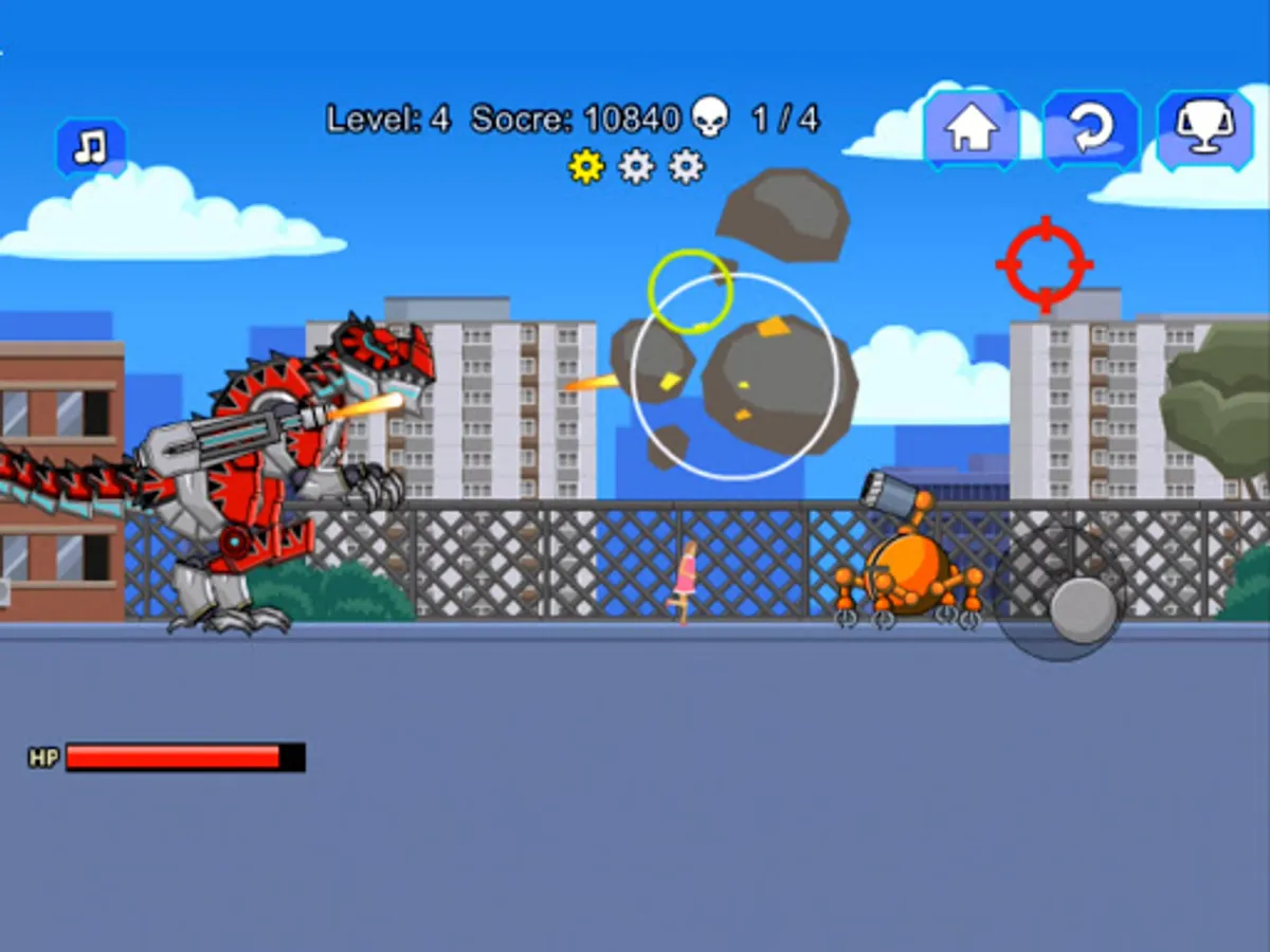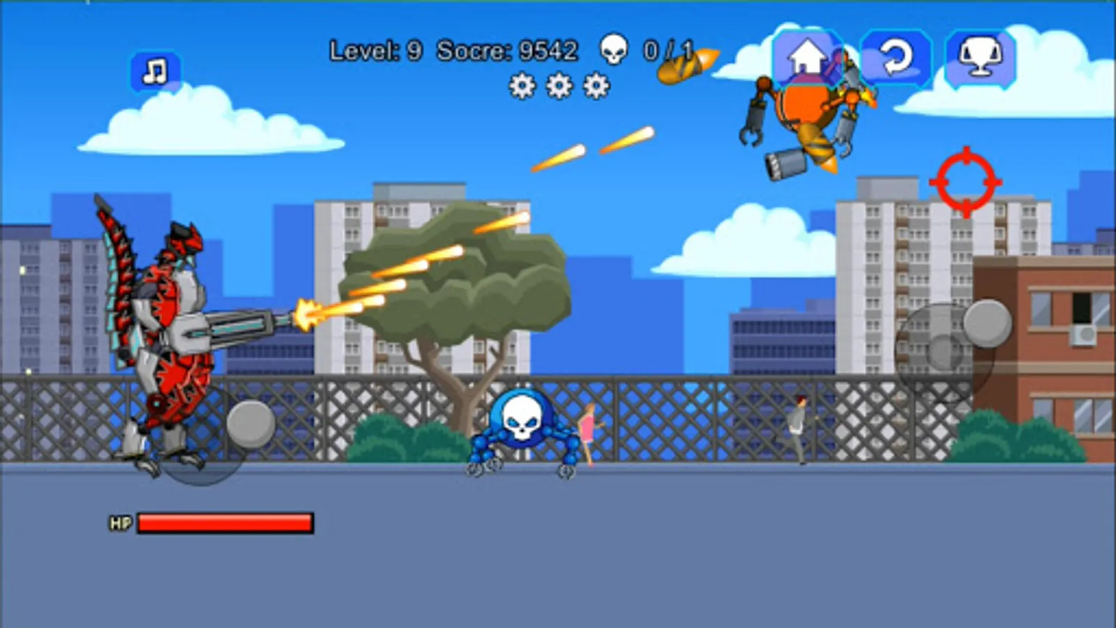Your task is assemble robot Red T-Rex Dinosaur, defeat robot aliens. Driving your Red T-Rex, through the city, keep moving along.There are many people running on the streets, they are avoiding the robot aliens, only you could stop the terrible things happen!