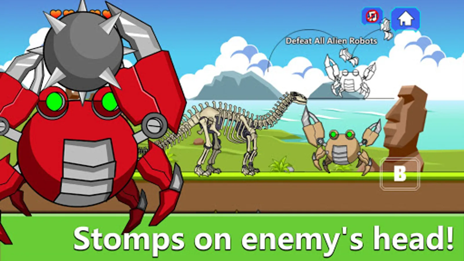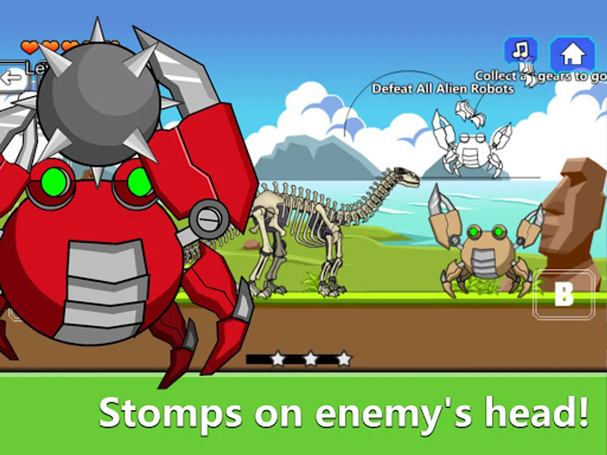 Ceate a skeleton Brontosaurus robot with the dinosaur fossils join the dinosaur army. Adventure underwater area, defeat all Alien Crab robots.