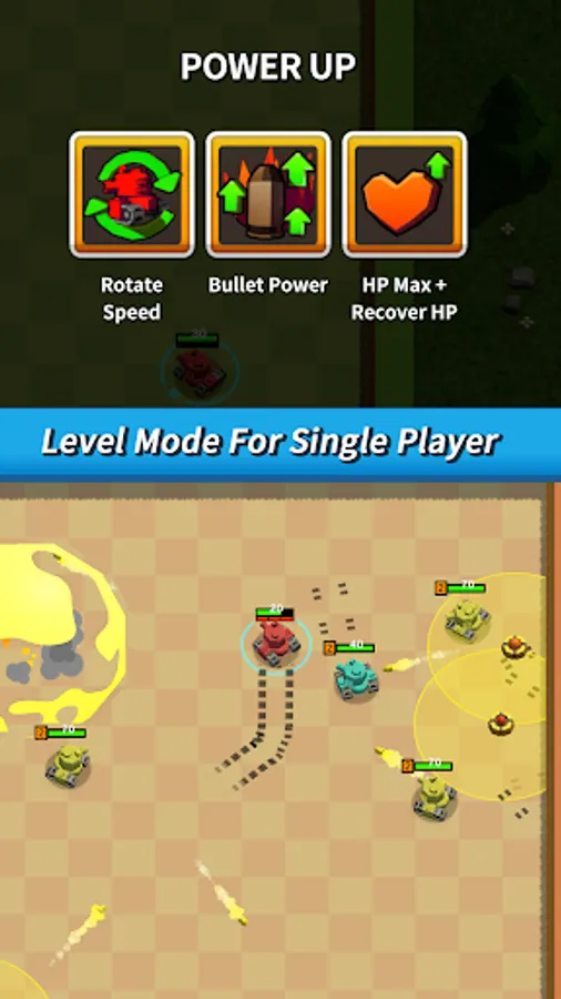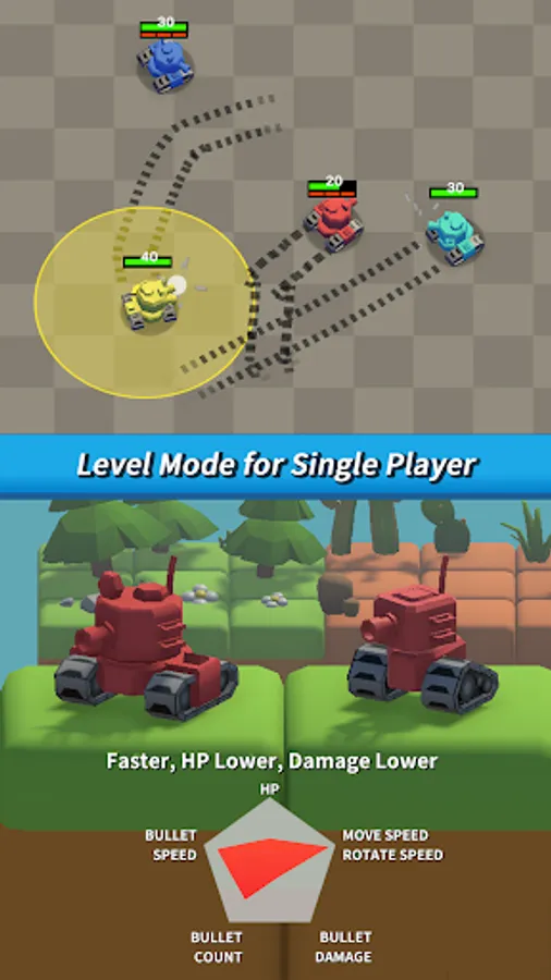 There are four types of tanks to choose, with differences in speed, HPMax, and bullet power etc.