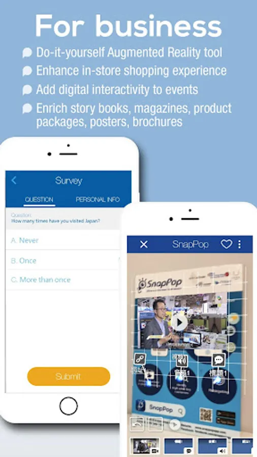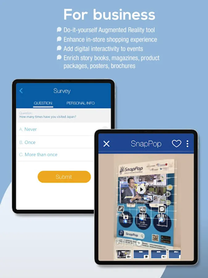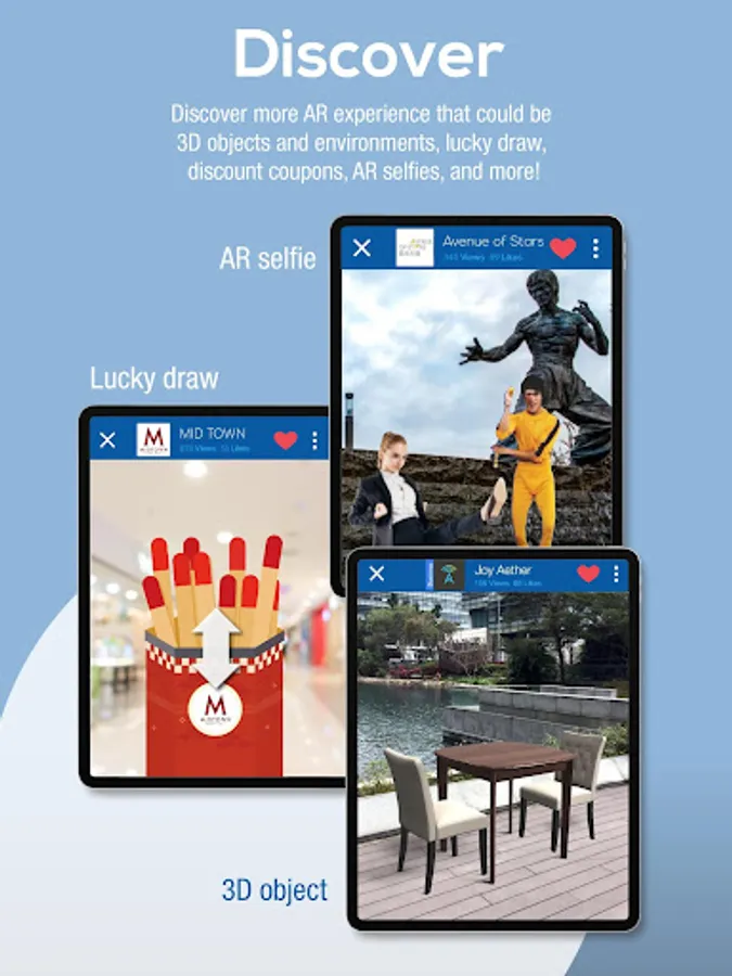 An interactive, fun and memorable experience! When you scan a poster, a billboard, or a product package that is SnapPop-enabled, we will work our magic and pop up interesting contents for you! You can discover 3D objects and environments (Augmented Reality / AR), lucky draws, trailer videos, and more!