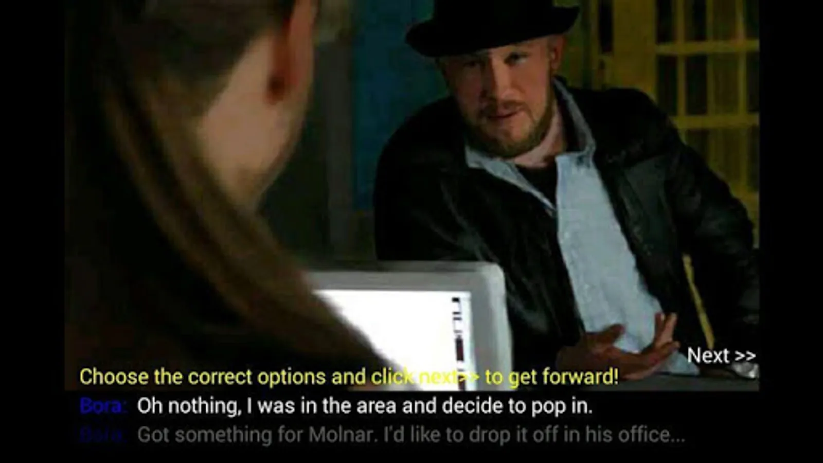 Then there are sequences where you talk to someone, and need to pick the right multiple-choice responses. If you fail, you need to start over. You get the first dialogs at the police station where you try to find information about the murder.