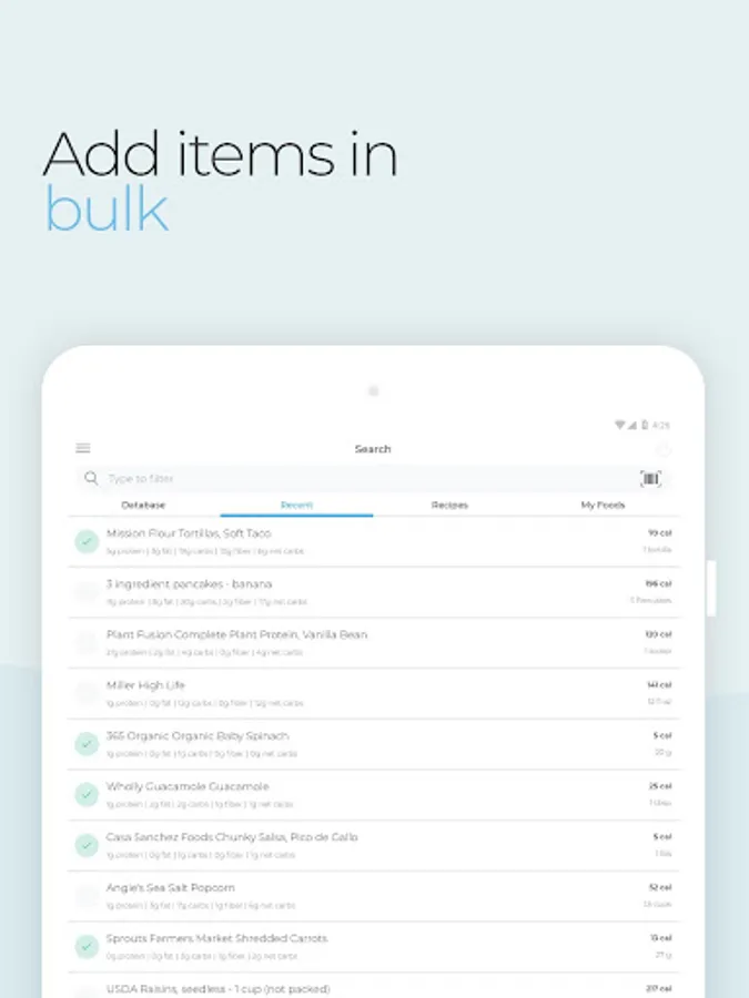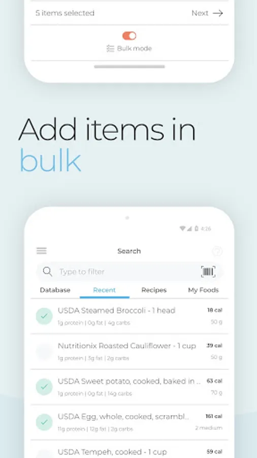 - Bulk mode allows you to select multiple foods at a time