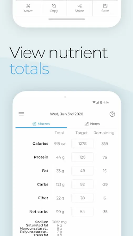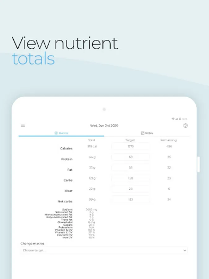 - Ability to view macro totals, targets and remaining values each day as well as micronutrients and vitamins.
