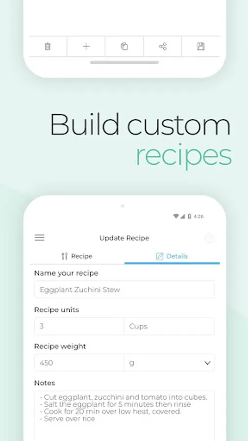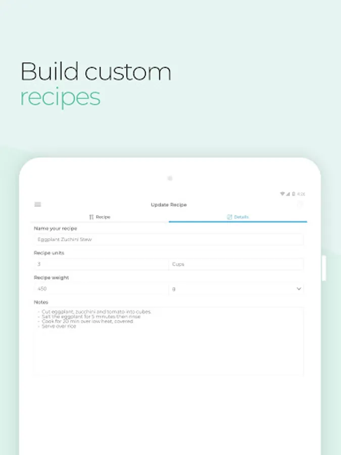 - Recipe builder - Save all of the ingredients from a meal as a custom recipe or build a recipe from scratch including ingredients, number of servings, serving sizes and cooking instructions.