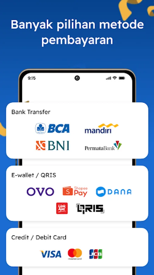 A complete selection of payment methods: VISA, Mastercard, DANA, OVO, Shopee Pay, QRIS, Mandiri, BCA, BNI, and others. Delivery tomorrow arrives!