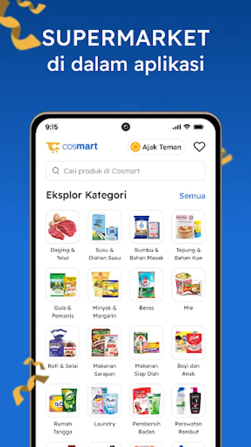 Fulfill household needs with various grocery shopping conveniences at Cosmart. Starting from Bear Brand milk, Sania cooking oil, Rinso detergent, Biore bath soap, to MamyPoko diapers. Products from world quality brands such as Nestle to Unilever and various other imported products.