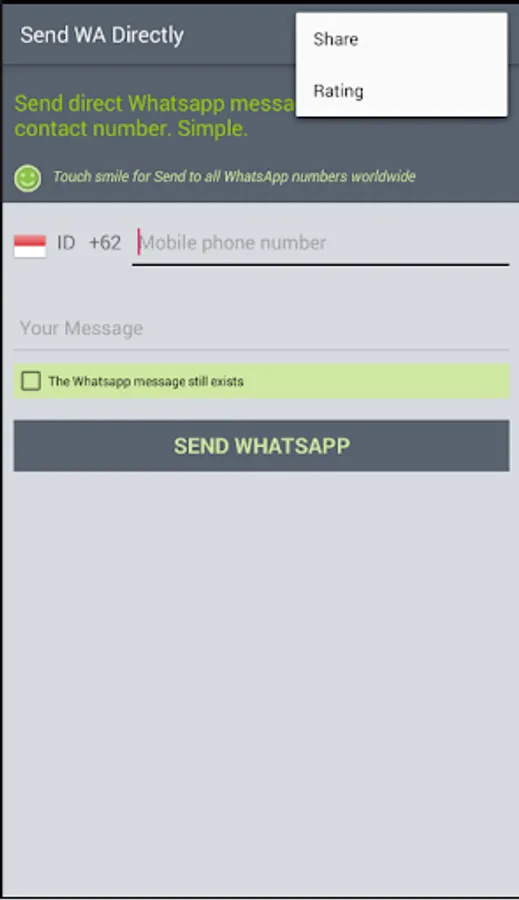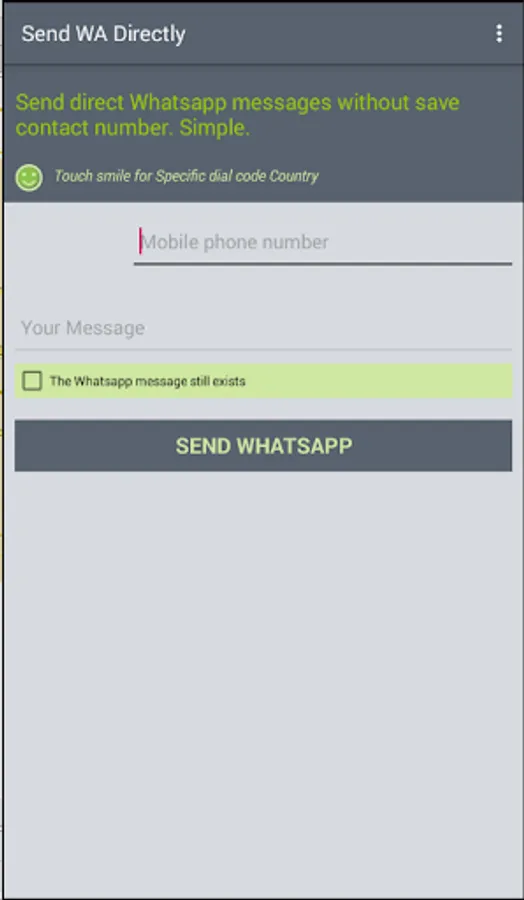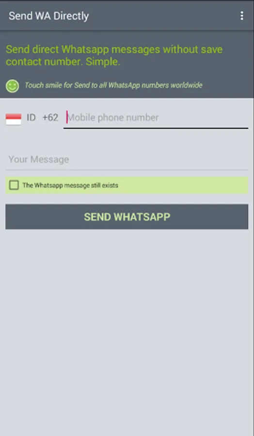 or if you want to send WA messages to other countries' numbers, you can click smile images, it will enter the mode to send to all numbers around the world ..