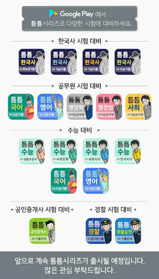 9th grade civil servants in major Korean history series ((national, private, Seoul, local, police, etc.) 10 years worth of questions from each series, including correct and incorrect answers, are provided without omission. Also, exams to be conducted later are immediately omitted. Since it is updated without it, this one app is enough to overcome previous problems.