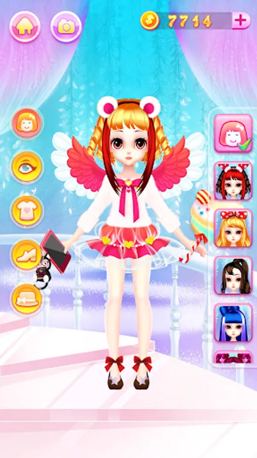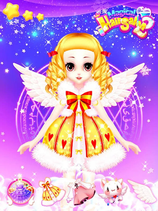 Beautiful hair style, fashion princess, lovely hair accessories, magic wings and dresses... all of your imagination are in dressing room. Choose a beautiful dresses and hair style for your lovely princess. There are so many dresses are waiting for unlocking.