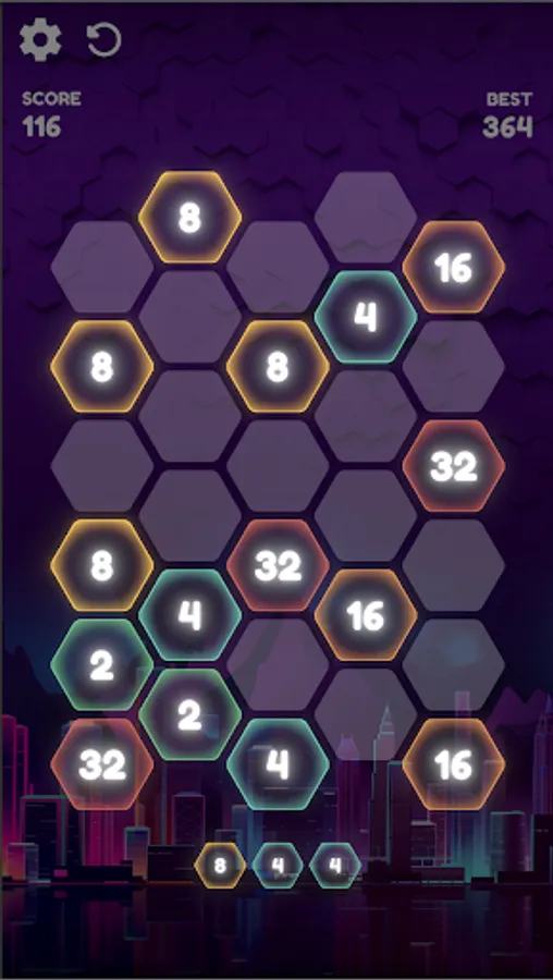 헥사 블럭을 누르고 다른 헥사 블럭으로 드래그하여 모든 공통 숫자를 밀고 합칩니다.