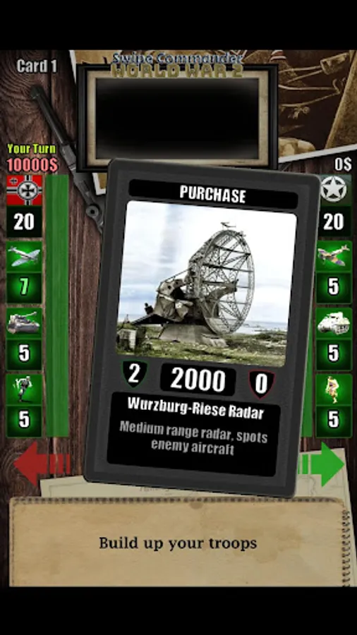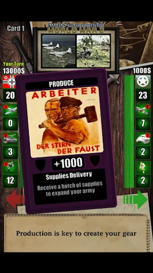 This is a World War 2 simulation played with a simple swiping mechanism. Purchase troops, tanks and airplanes; manage your defences and attack at the right moment. Be aggressive or let the enemy come to you, crush him with your own war tactics. This card swiping game is more complex as it seems, yet easy to play !
