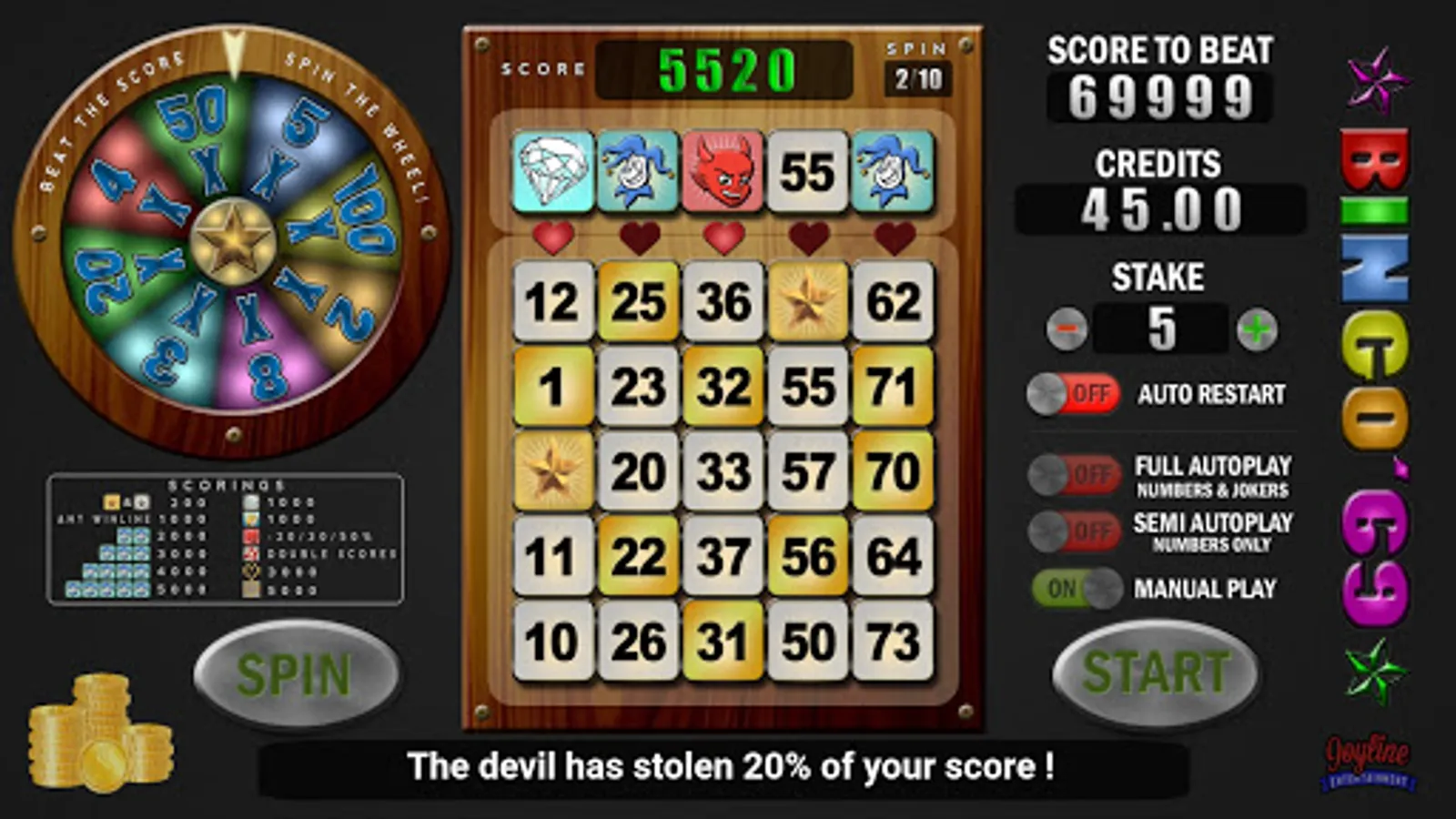 Bingo'69 is an advanced bingo game with many extra features compared to regular bingo: match numbers, use jokers to pick any number, get bonusses from diamonds and angels, but beware of the devil stealing your points away. Beat the score of 69999 for a spin on the wheel. Each spin on the wheel will give you from 2X up to 100X your stake.