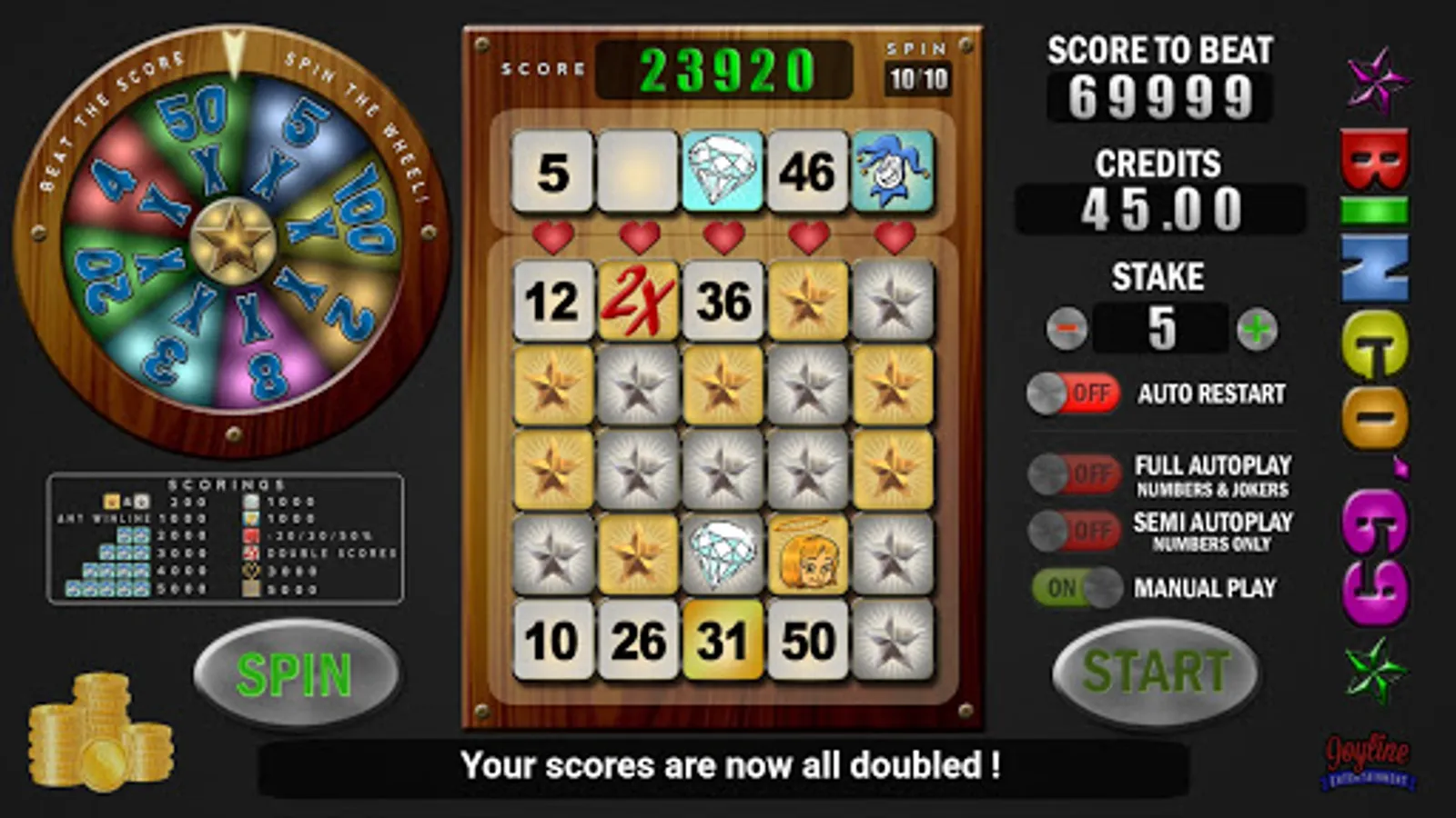 The game consists of 10 rounds (we managed to reduce from the original 20 rounds to make gameplay compact). Roll the numbers on top and match them on the board to collect as many points as you can. Match five numbers horizontal, vertical and diagonal for extra points (winlines).