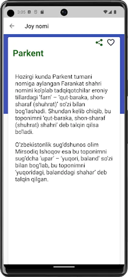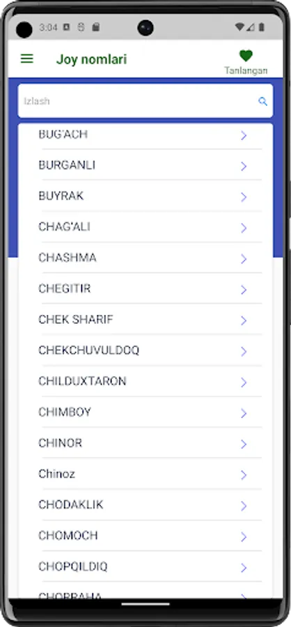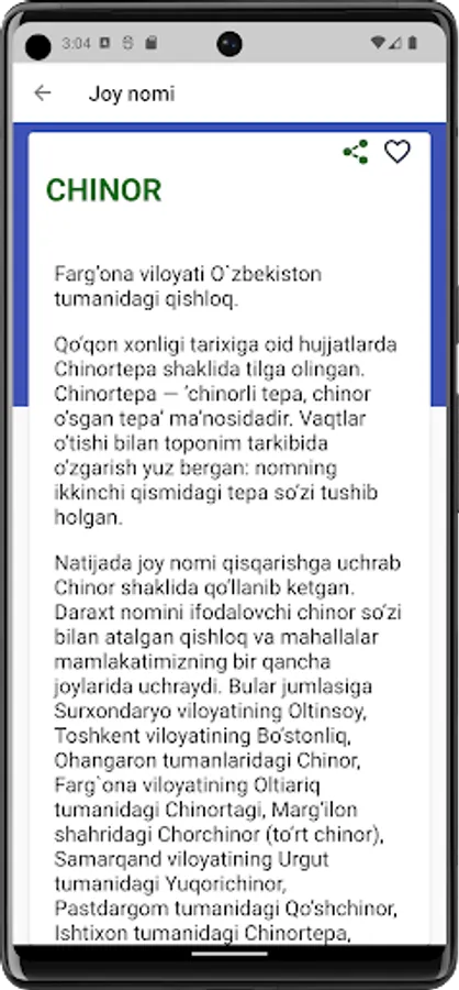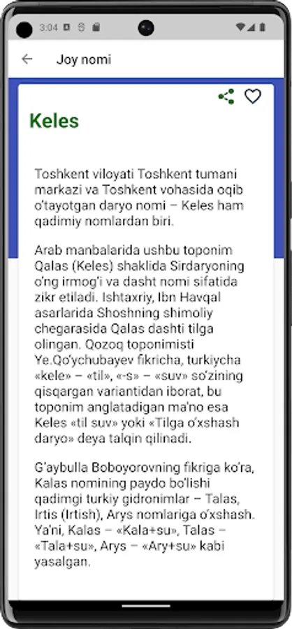 Bu ilovada imkon qadar O'zbekiston hududida joylashgan qishloq va shaharlar nomlari , ularni kelib chiqishi haqida ma'lumotlar to'plangan. Bu ma'lumotlar kelgusida yanada kengaytirib boriladi.