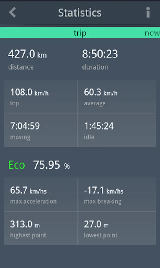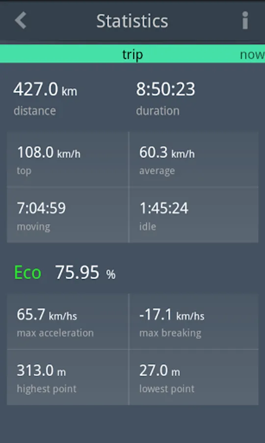 ● The motion efficiency indicator on the base of velocity, speedup and elevations analysis, permits you to correct your driving style and reduce fuel consumption in real time.