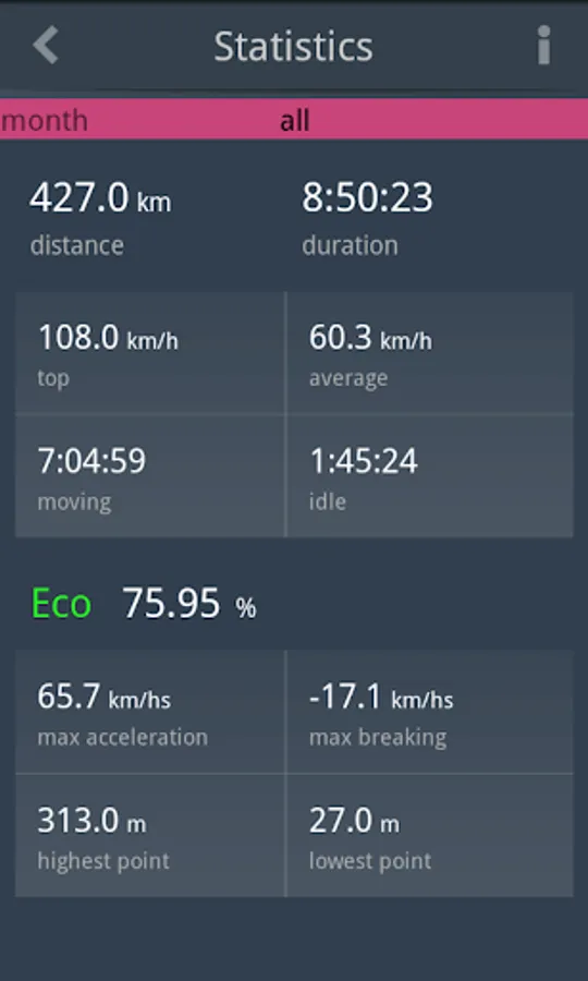 ● All useful indicators are on the main screen, thus allowing you to control the elapsed distance, time, acceleration, height, maximum and average speed. You can switch between indicators of maximum and average speed, haul and time of various periods with a single touch.