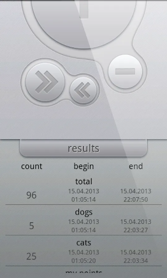 The application allows you to produce an accurate count, even distracted by other activities and store the results as long as desired (the lite version, as opposed to full version, saves values of only first two counters).