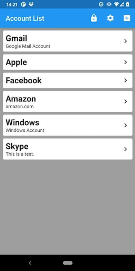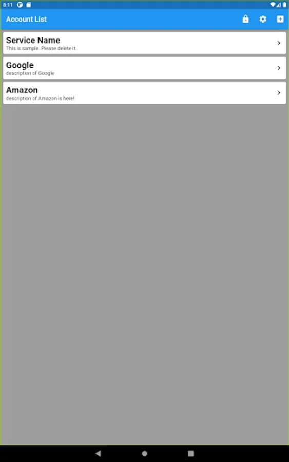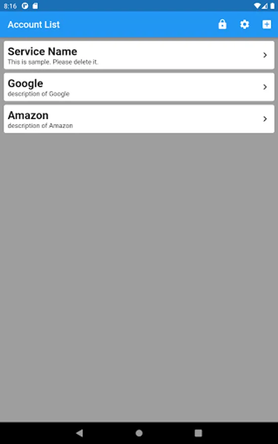The service names of all the accounts managed by the app and their outlines are displayed in a list. Items in the list can be deleted by swiping left or right, and sorted by long-pressing.