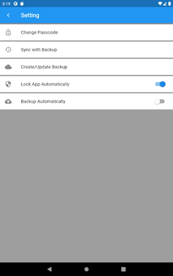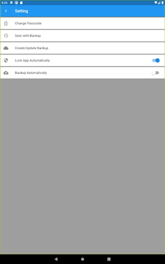 The app is protected by a lock function that is independent of the device lock screen and can be unlocked by a 6-digit number (passcode) or fingerprint authentication. It locks automatically when you put your device to sleep or open another app.