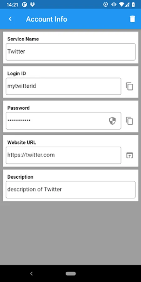 This screen allows you to edit and check the service name, ID, password, website URL, and service description.