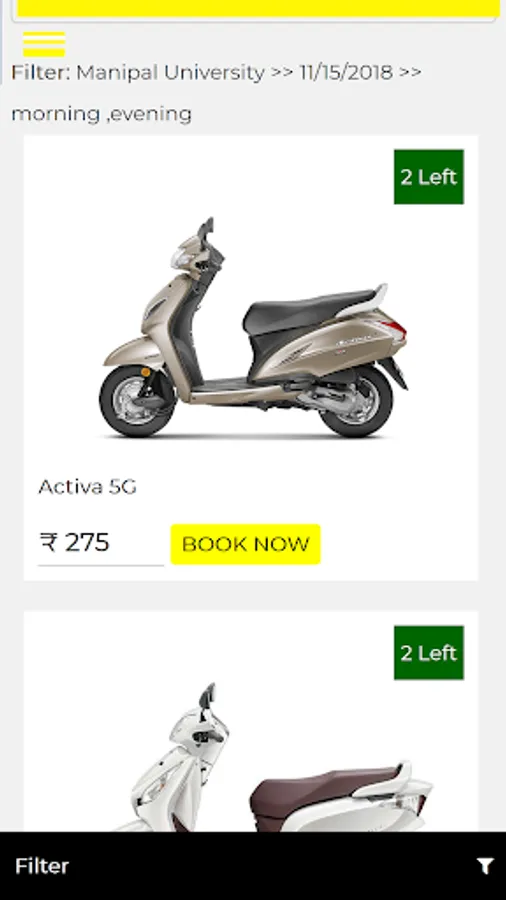 • pick out motorcycle:- the next screen will display you the available bike models for the chosen region and time duration entered by you. The screen can even display the tariff and the security deposit to be paid for the respective bike. Please note that the deposit has to be paid at the same time as taking the delivery of the motorcycle. You only have to pay the tariff quantity via the application to book the motorbike.