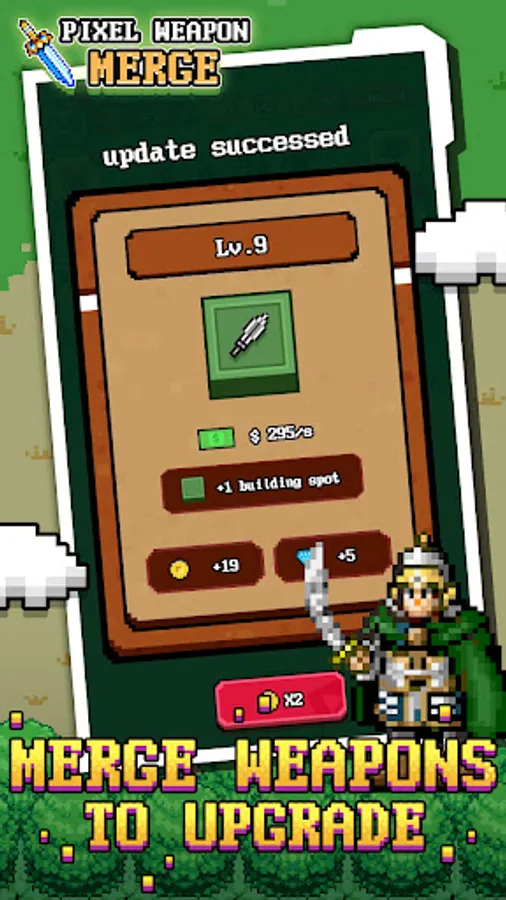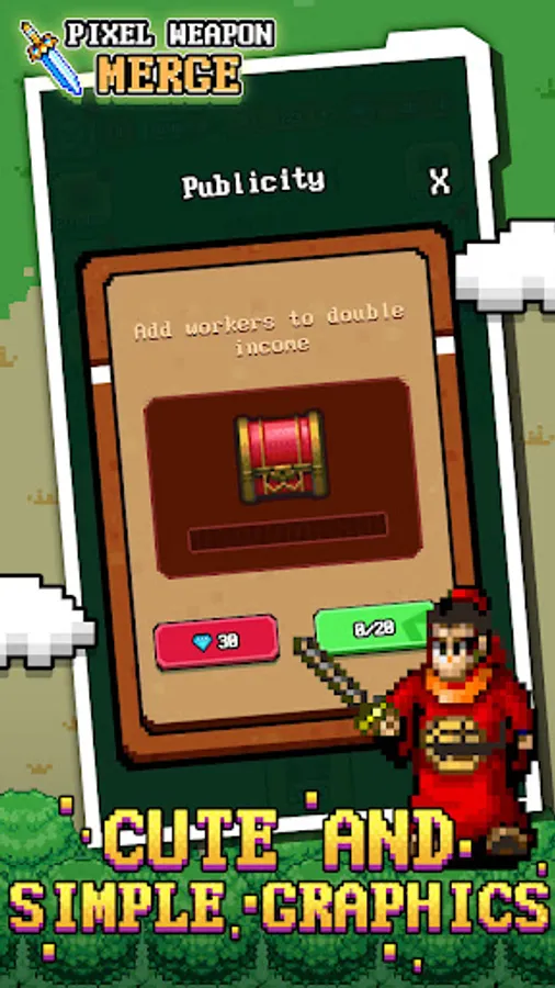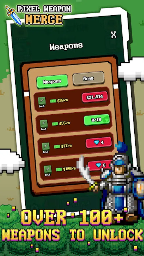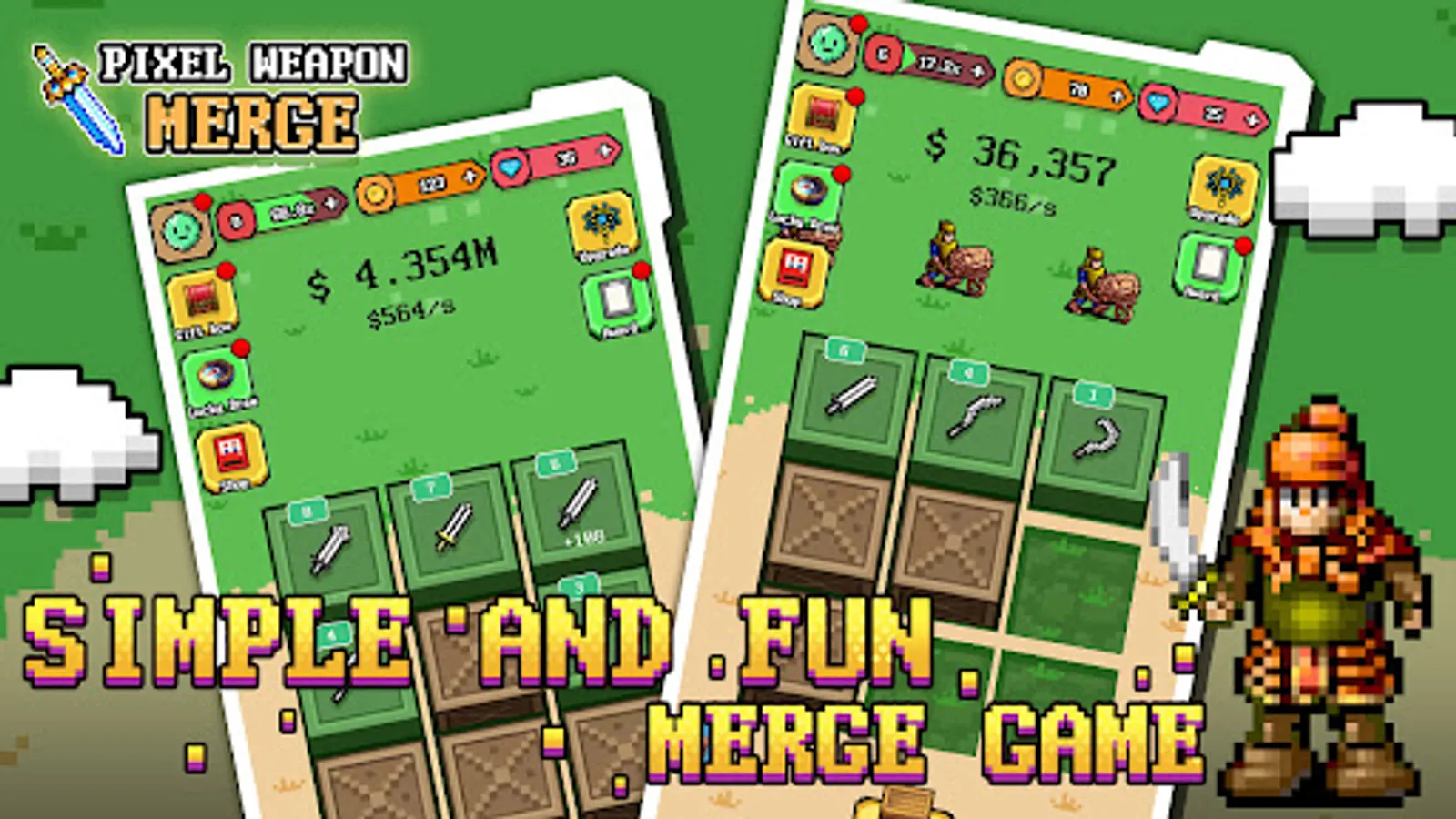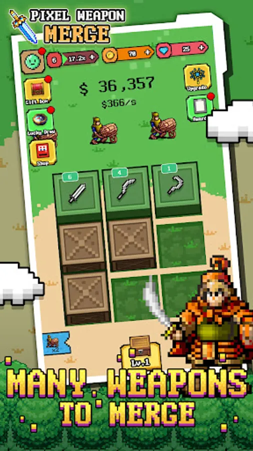 Pixel weapon merge is a creative casual puzzle synthesis game. Players can get weapons of different levels through the weapon box. Weapons of the same level can be merged into high-level weapons. Combining weapons of a new level can open up new areas and get double rewards , building new areas can create great wealth and collect more gold coins.