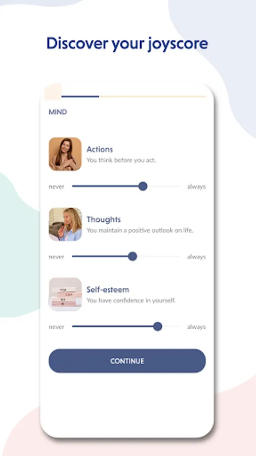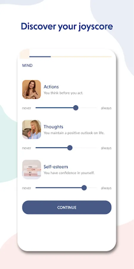 Discover what it means to experience true joy and prioritize self-care. JoyScore allows you to tune out anxiety and negative self-talk and focus on creating the life you want. The JoyScore app is here to help you track your progress and keep you motivated on your health and happiness journey. Get the motivation you need to take charge of your life through fun, simple, powerful habits designed for you.