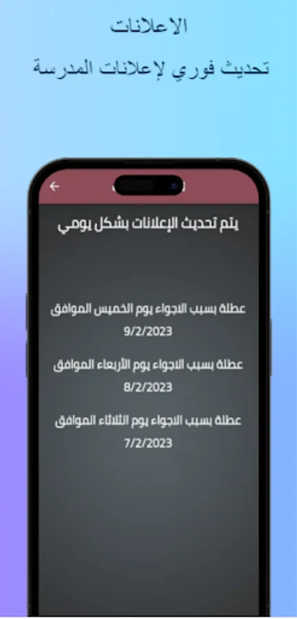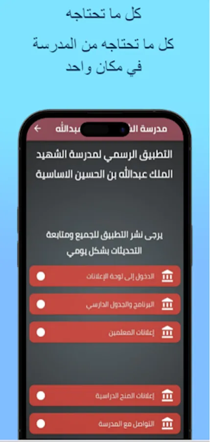 This application is for following up on the Martyr King Abdullah Bin Al Hussein Elementary School, where you can follow everything you need and everything you want from the program of classes and exams for the Martyr King Abdullah Bin Al Hussein Elementary School. We also provide you with ways to communicate with the school and everything you need to keep in touch with us continuously.