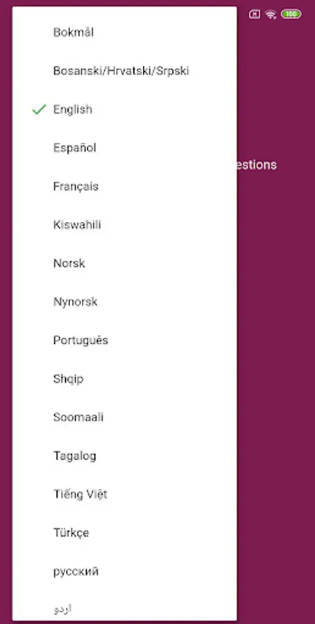 Bokmål, Bosanski / Hrvatski / Srpski, English, Español, Français, Kiswahili, Norwegian, Nynorsk, Português, Shqip, Soomaali, Tagalog, Tiếng Việt, Türkçe, русский, اردو, العربية, دری, سۆرانی, ف ไทย, ျ မန္ မာ, ትግርኛ, ኡይጉርኛ, 中文