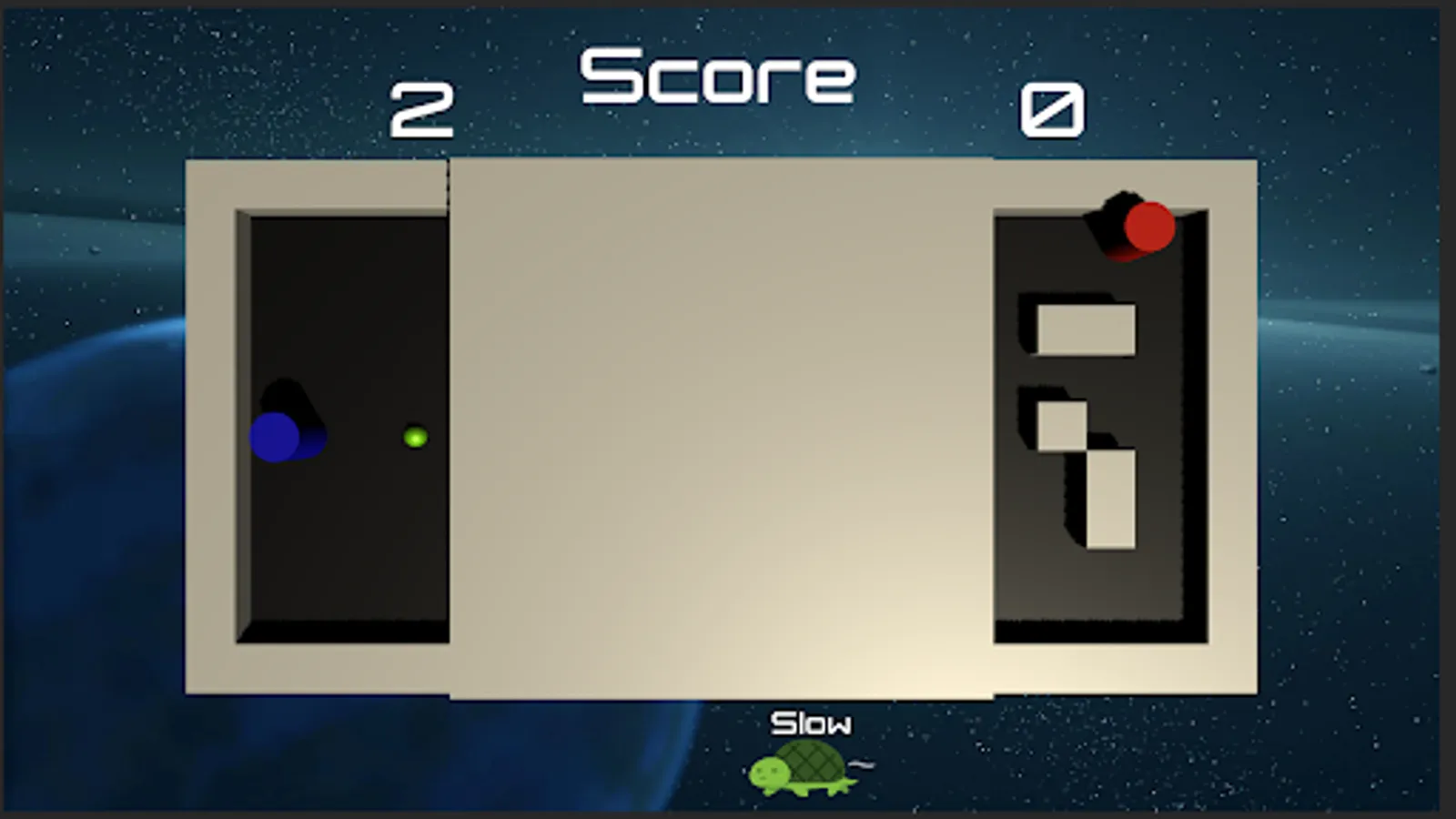 You can move the blue mallet by using the joystick provided on the left side of the screen. Multiple balls will appear on the stage. Each time this ball touches the mallet, the speed of the ball will increase. When the ball hits the edge of the stage, you will get points. The game is over when this score reaches 5. In normal mode, obstacles of various shapes will appear on your opponent's field, preventing you from scoring points. In extra mode, in addition to the elements of normal mode, you can use the Slow skill to slow down the speed of the first ball that appears. In addition, after a certain period of time, your mallet will disappear, and a part of the field will not be visible at random, and an event will occur.
