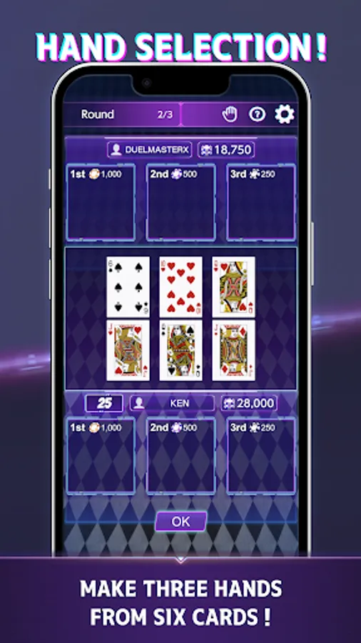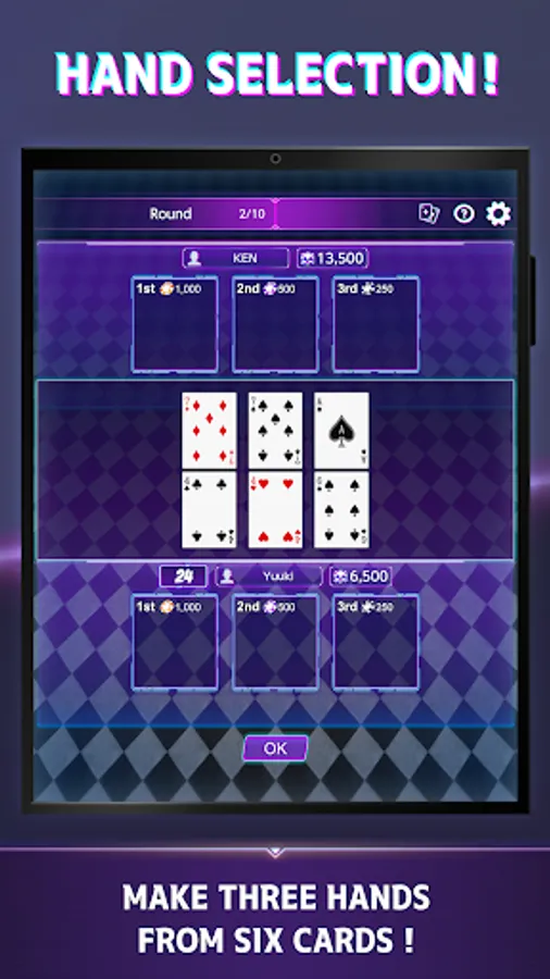 お互いのプレイヤーは6枚のカードが配られ、3つのハンド(1st・2nd・3rd)を作ります。