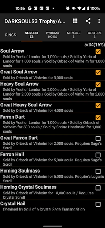 Enhance your DARKSOULSⅢ experience with our app! Manage and track your progress towards acquiring Rings, Sorceries, Pyromancies, Miracles, and Gestures needed to complete all trophies and achievements. Easily mark your acquired items and see the completion progress (%) at a glance. We provide detailed instructions on how to obtain each item, ensuring a smooth journey towards unlocking your desired trophies. Say goodbye to unnecessary clutter as we only include the essential items for trophy/achievement acquisition. Download now and conquer DARKSOULSⅢ like never before!
