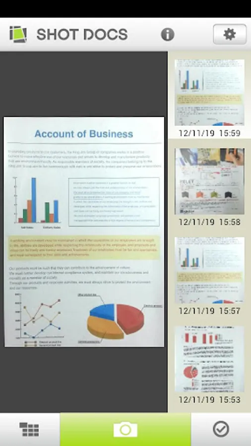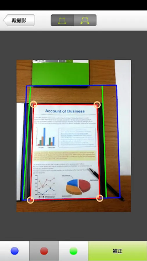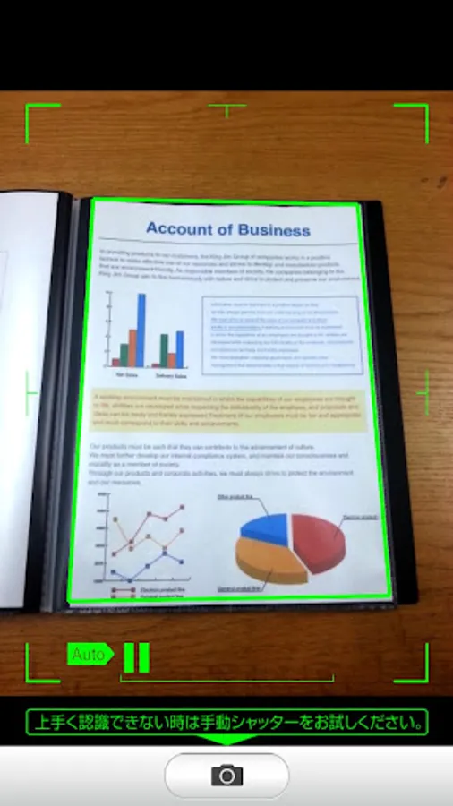 When shooting a document by this app, it recognizes the edges of document, then trim and adjust it automatically. You can get a document just fit in the screen.