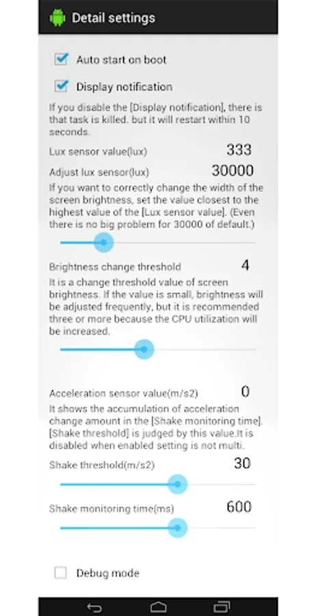 1. The maximum and minimum brightness can be set arbitrarily when the backlight brightness is automatically adjusted. (Android 4.4+, or Rooted 4.3 or lower only)