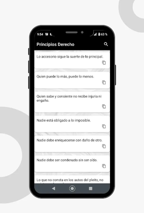 With this application you will be able to have at hand the general principles of Law, so that you can cite or use them, in your learning at the University or in the world of litigation.
