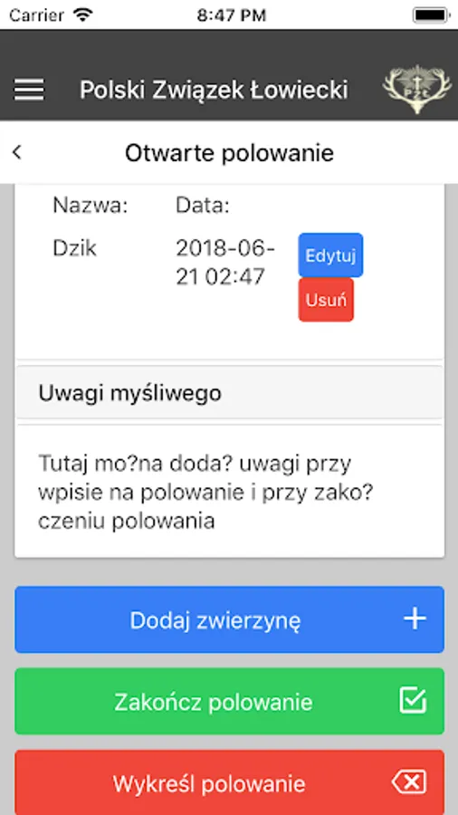 PZŁ EKEP - electronic book of hunting records is a mobile part of the production system of the Polish Hunting Association, created for comprehensive service of Hunting Associations. The application is intended for hunting hunters, and its main purpose is the ability to view and record hunters' stay in the hunting district.