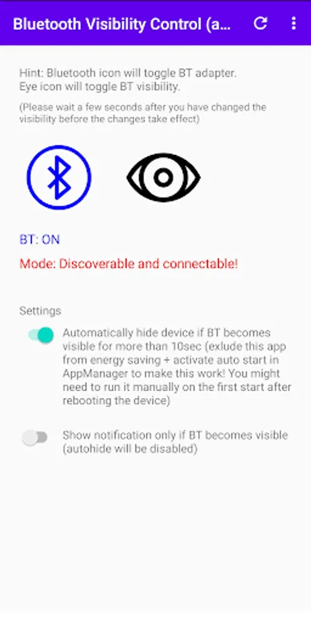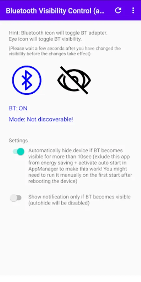 Take control of your Bluetooth visibility settings. With Bluetooth Visibility Control you can switch your bluetooth visibility to hidden and toggle your BT adapter. There are many devices on the market that cannot switch the visibility to hidden when BT is activated (e.g. some MIUI devices). There is also an auto-hide feature that allows BT visibility to be toggled automatically when the BT stack is turned on.