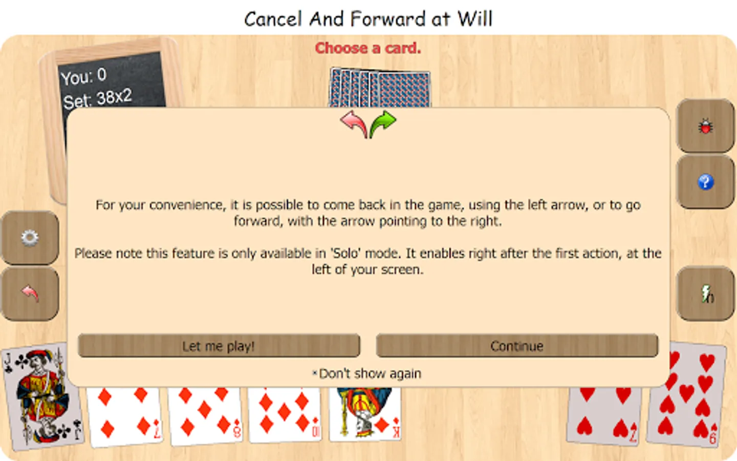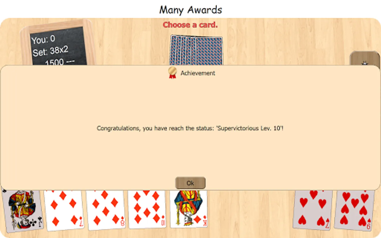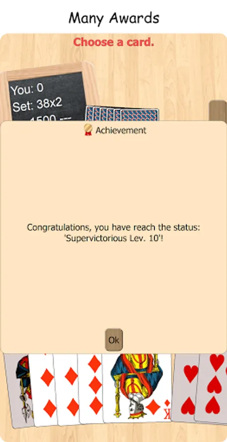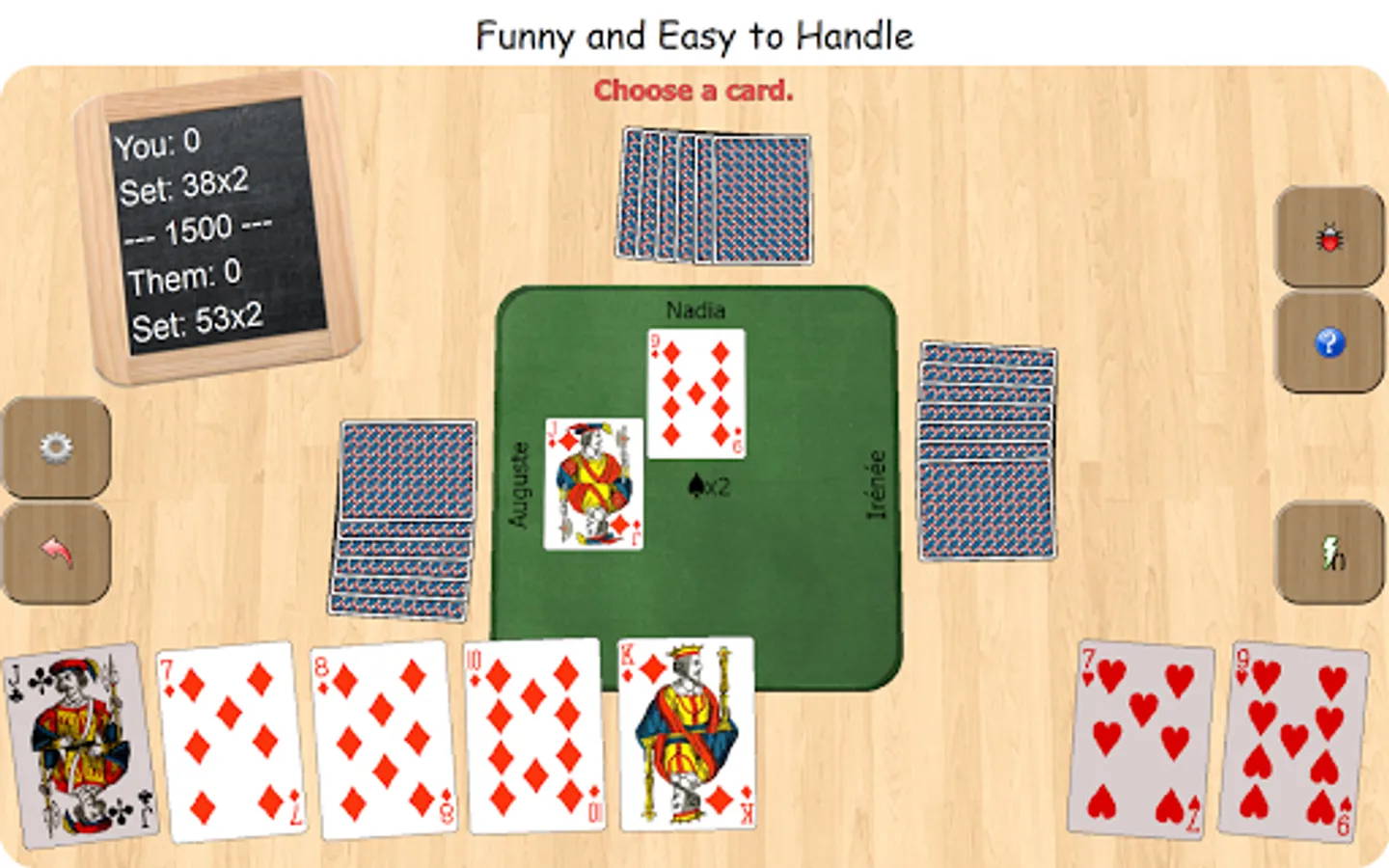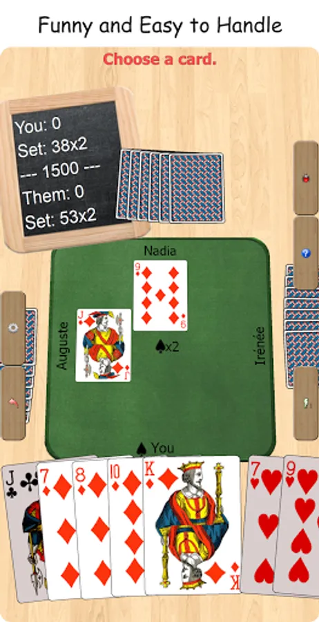 Developed to have fun alone or with friends, with the variants Swiss French 'simple', 'pique double', or the Swiss German 'unte-ufe' and 'zig-zag'. If you are alone, the partner and the opponents are simulated by the computer, with an efficient artificial intelligence.