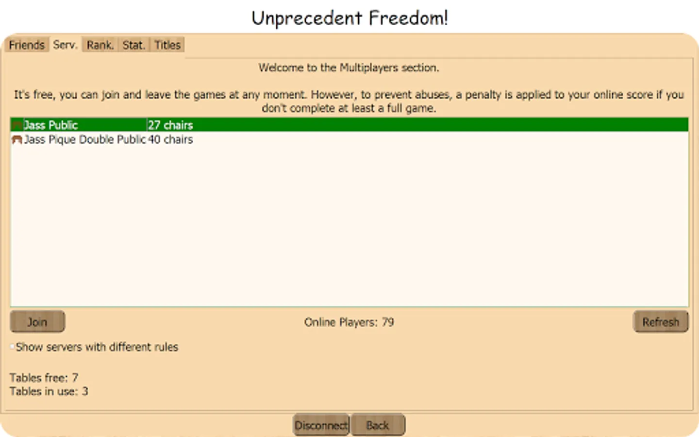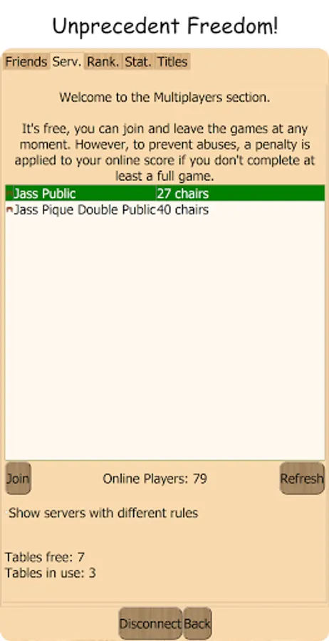 -Join and leave (after 1 game min.) whenever you want: Total freedom and never wait.
