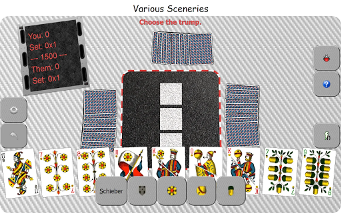 The Schieber Jass for mobile (or Chibre in French), funny, free and easy to handle, Multiplayer or Solo.