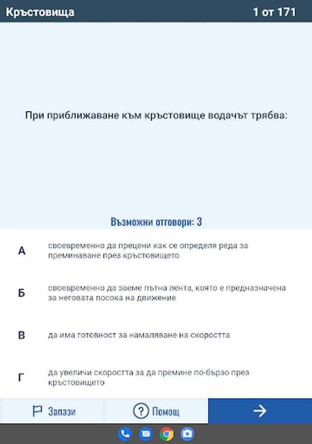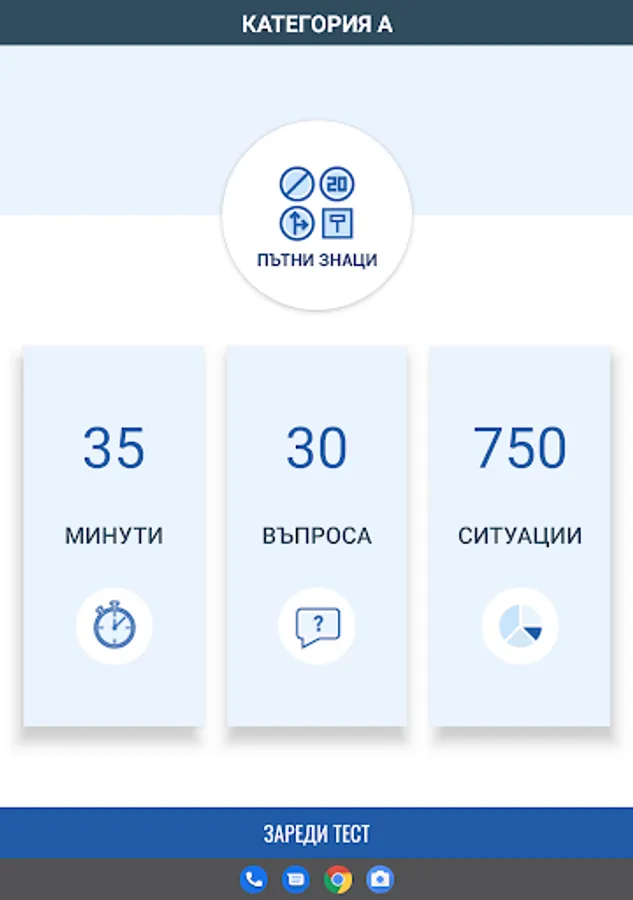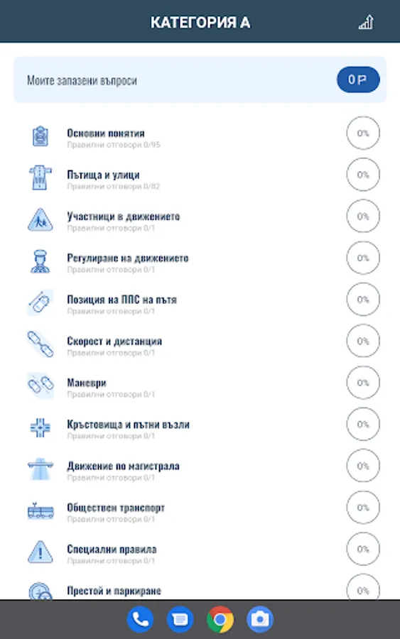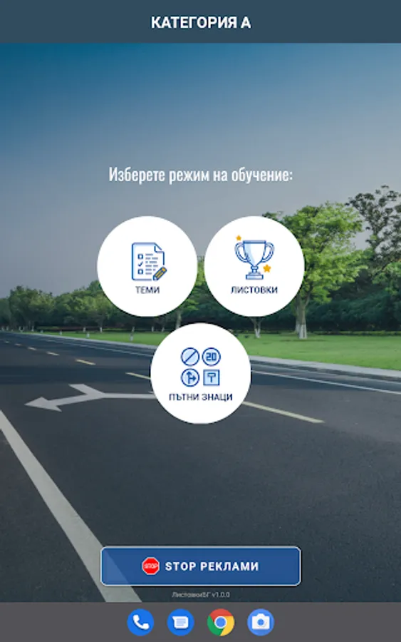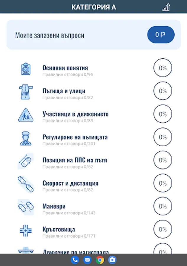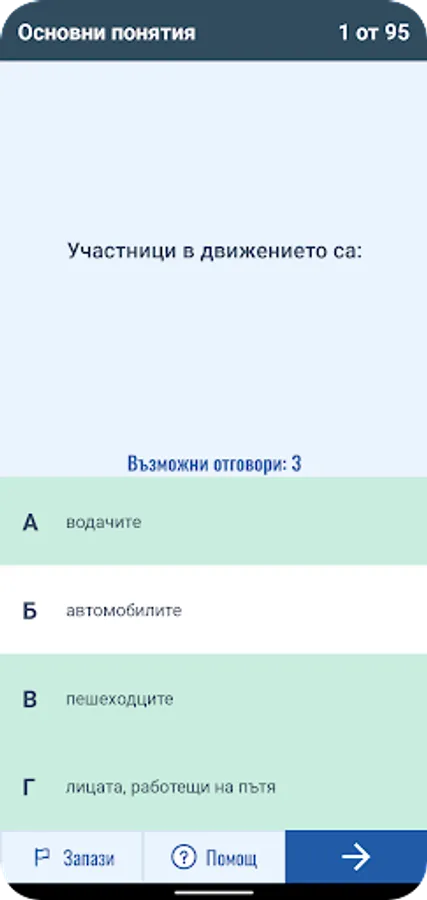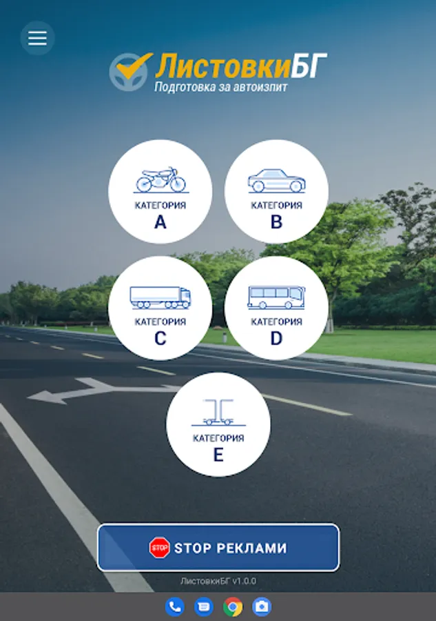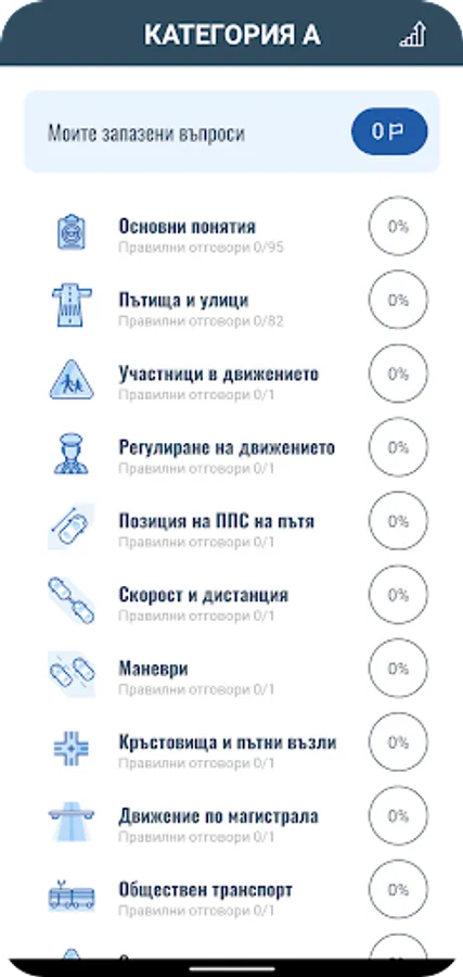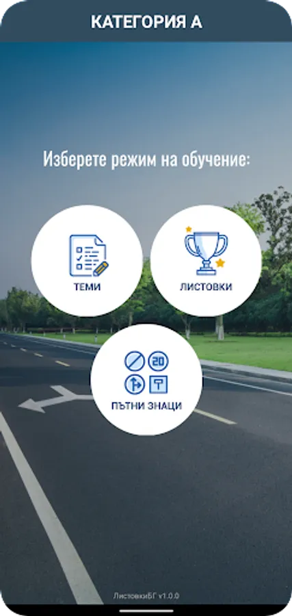 Приложението включва въпроси от категориите A, B, C, D и E, като всяка категория разполага с три режима на обучение.