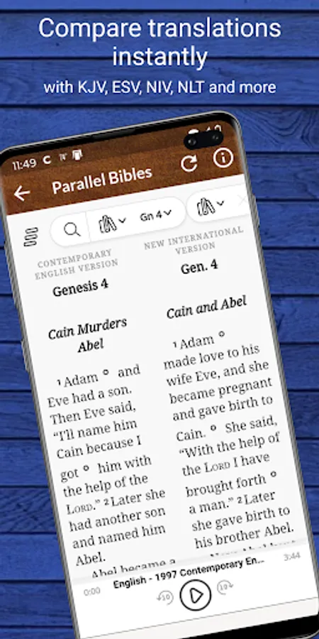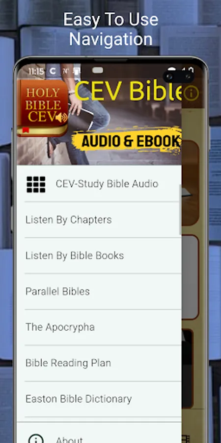 The app includes the complete Contemporary English Version (CEV) Bible audio and ebook. A dramatic reading audio and the ebook Study Bible - Old and New Testament plus many free features.