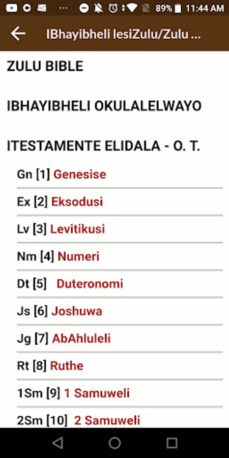 The Holy Bible in Zulu consists of 39 books in the Old Testament (Gn [1] Genesise,Ex [2] Eksodusi, Lv [3] Levitikusi, Nm [4] Numeri, Dt [5] Duteronomi, Js [6] Joshuwa, Jg [7] AbAhluleli,Rt [8] Ruthe, 1Sm [9] 1 Samuweli, 2Sm [10] 2 Samuweli,1Kn [11] 1 AmaKhosi, 2Kn [12] 2 AmaKhosi,1Ch [13] 1 IziKronike, 2Ch [14] 2 IziKronike,Ez [15] Ezra, Nh [16] Nehemiya, Es [17] Esteri, Jb [18] Jobe, Ps [19] AmaHubo, Pr [20] IzAga, Ec [21] UmShumayeli, Sn [22] IsiHlabelelo SeziHlabelelo, Is [23] Isaya, Jr [24] Jeremiya, Lm [25] IsiLilo, Ez [26] Hezekeli, Dn [27] Daniyeli, Hs [28] Hoseya, Jl [29] Joweli, Am [30] Amose, Ob [31] Obadiya, Jh [32] Jona,Mc [33] Mika,Na [34] Nahume, Hk [35] Habakuki, Zp [36] Zefaniya, Hg [37] Hagayi, Zc [38] Zakariya,Ml [39] Malaki ) and 27 books in the New Testament (Mt [40] Mathewu, Mk [41] Marku,Lk [42] Luka, Jn [43] Johane, Ac [44] IzEnzo, Rm [45] AmaRoma, 1Cr [46] 1 Korinte, 2Cr [47] 2 Korinte, Gl [48] Galathiya,Ep [49] Efesu, Ph [50] Filipi, Cl [51] Kolose, 1Th [52] 1 Thesalonika, 2Th [53] 2 Thesalonika,1Tm [54] 1 Thimothewu, 2Tm [55] 2 Thimothewu,Tt [56] KuThithu, Pl* [57] KuFilemoni, Hb [58] KumaHeberu, Jm [59] EkaJakobe,1Pt [60] 1 Petru, 2Pt [61] 2 Petru,1Jh [62] 1 Johane, 2Jh [63] 2 Johane, 3Jh [64] 3 Johane, Jd [65] EkaJuda, Rv [66] IsAmbulo
