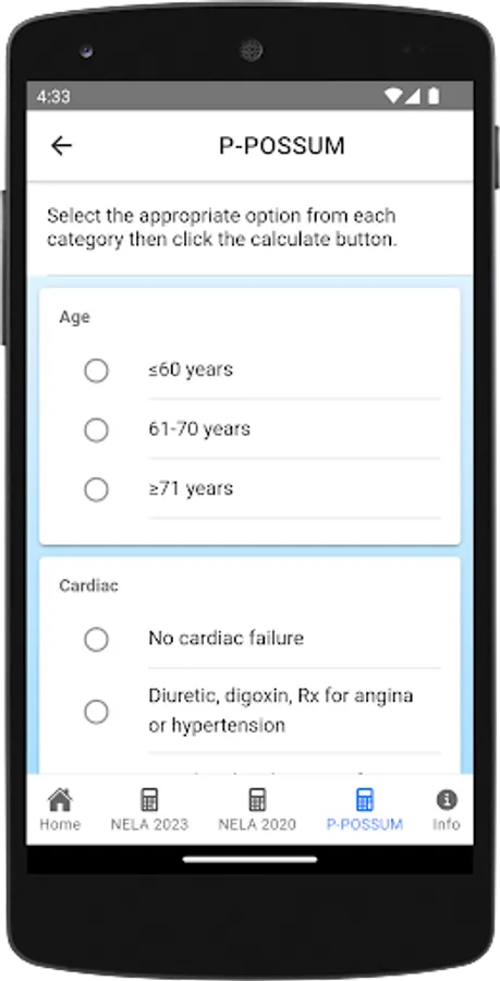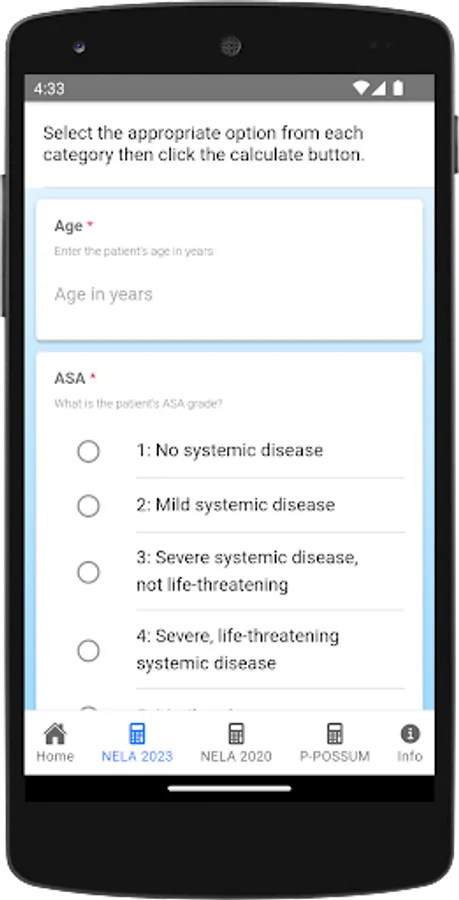 This calculator enables clinicians to enter clinical data and generate risk estimations based on two popular models: NELA (the National Emergency Laparotomy Audit) and P-POSSUM. These risk scoring tools are widely used to risk assess patients for emergency laparotomy.