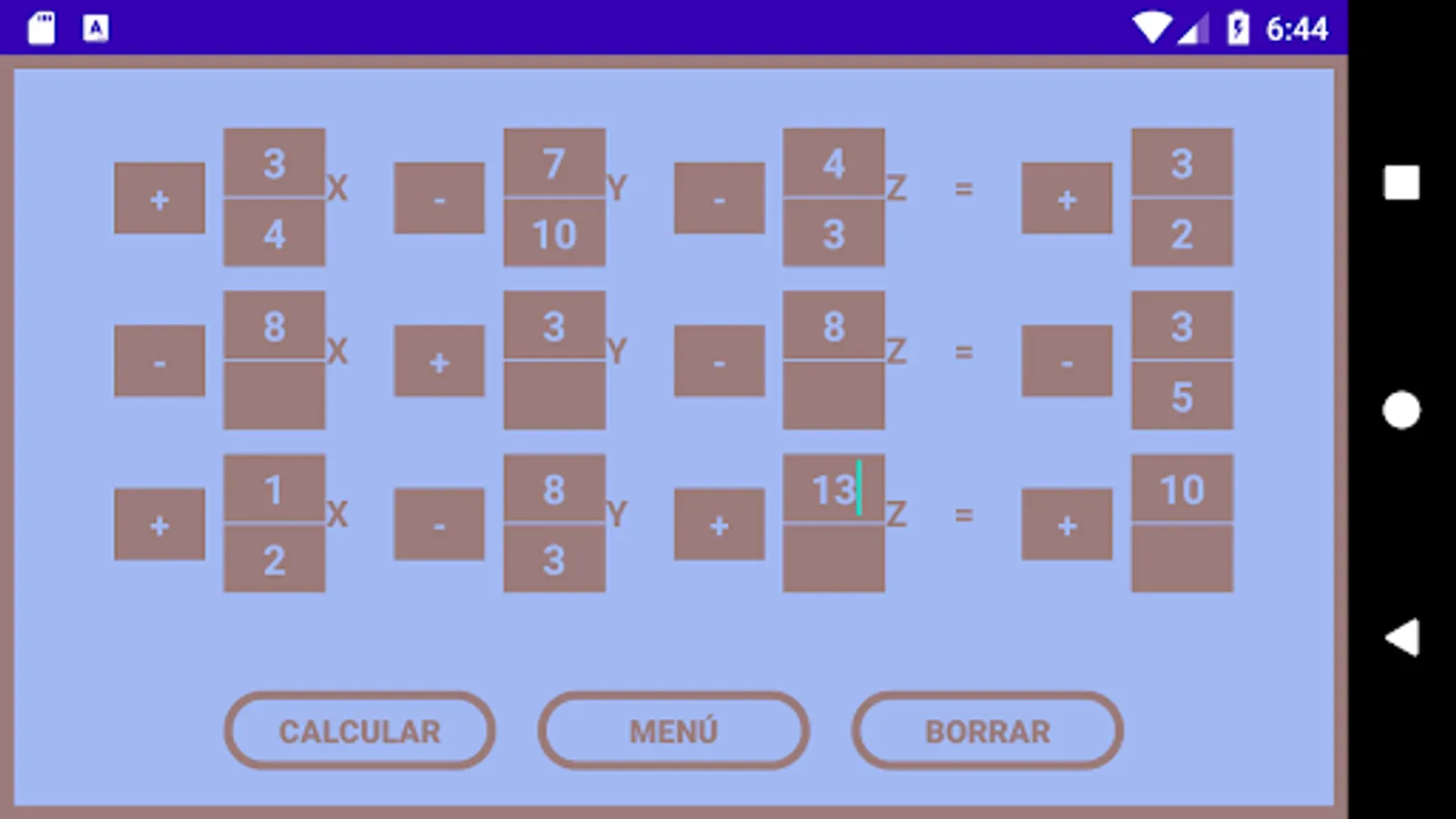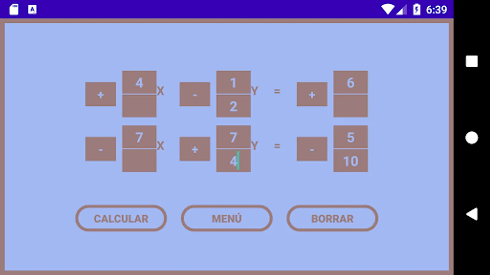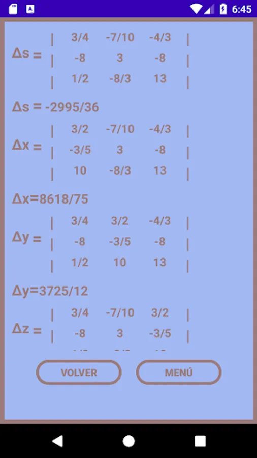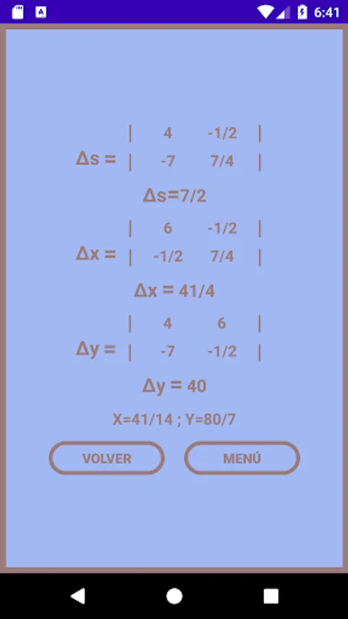 Aplicación permite resolver ecuaciones con o sin fracción a través de la regla de cramer, las ecuaciones pueden ser de 2x2 y 3x3.